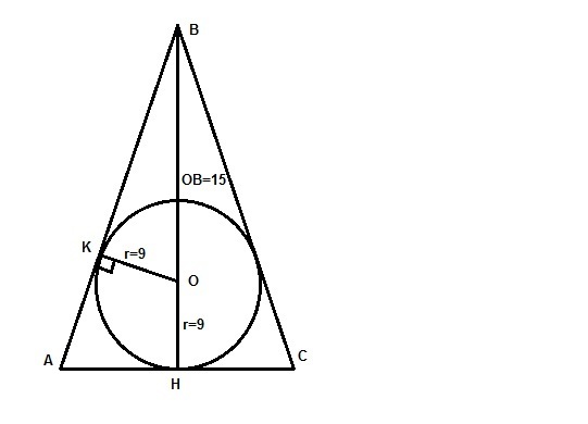 Вот рисунок. По условию OK = OH = r = 9; OB = 15.
