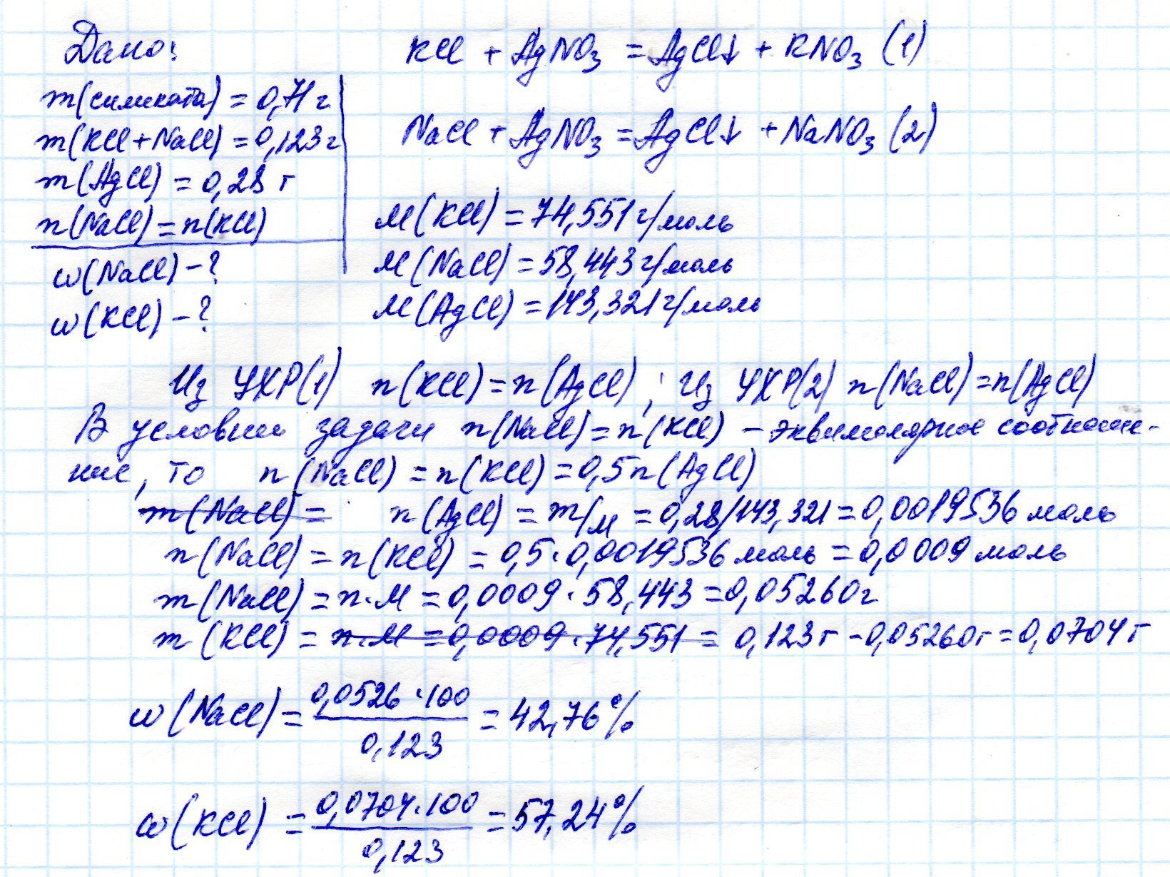 При анализе навески силиката массой 0,7100 г была получена смесь хлоридов калия и натрия массой 0,1230 г. Затем из этой смеси был осажден хлор в виде AgClмассой 0,2800 г. Вычислить процентное содержание NaClи KClв образце (используя эквимолярное соотношение)
