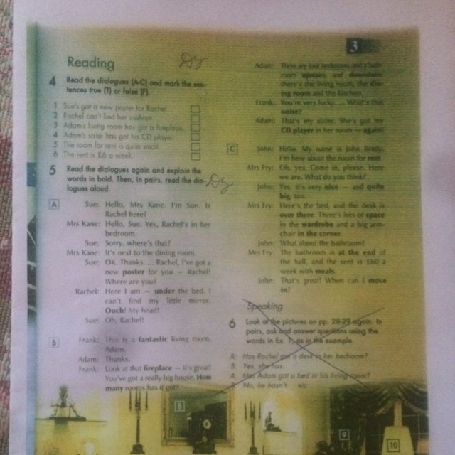 Помогите!!!!прочитайте диолог[5]и ответь true(T)или false(F){4}