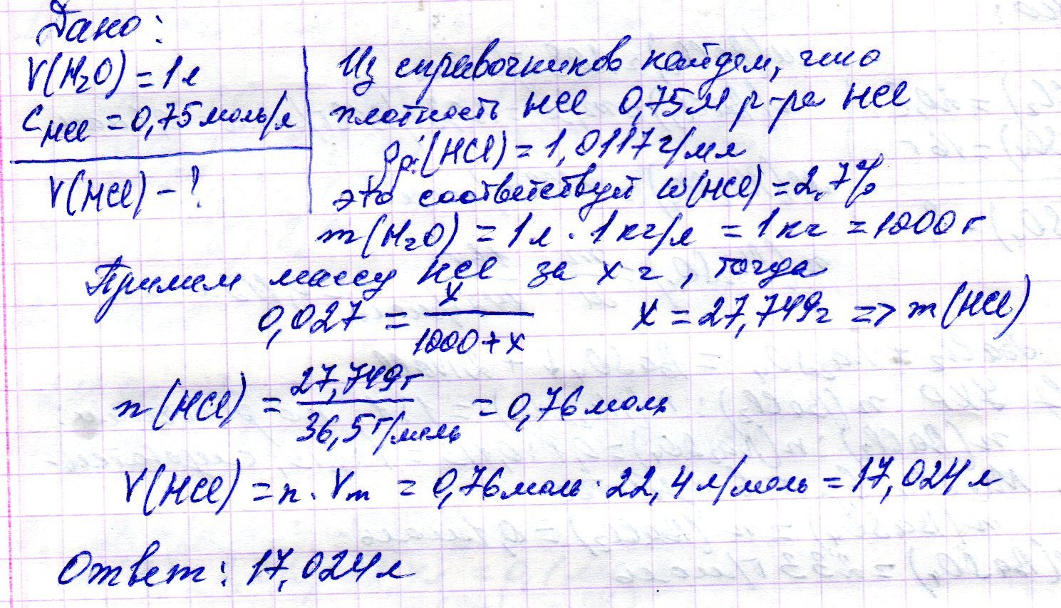 Сколько литров хлороводорода измеренного при н.у нужно растворить в 1 литре воды чтобы получить 0.75молярный раствор