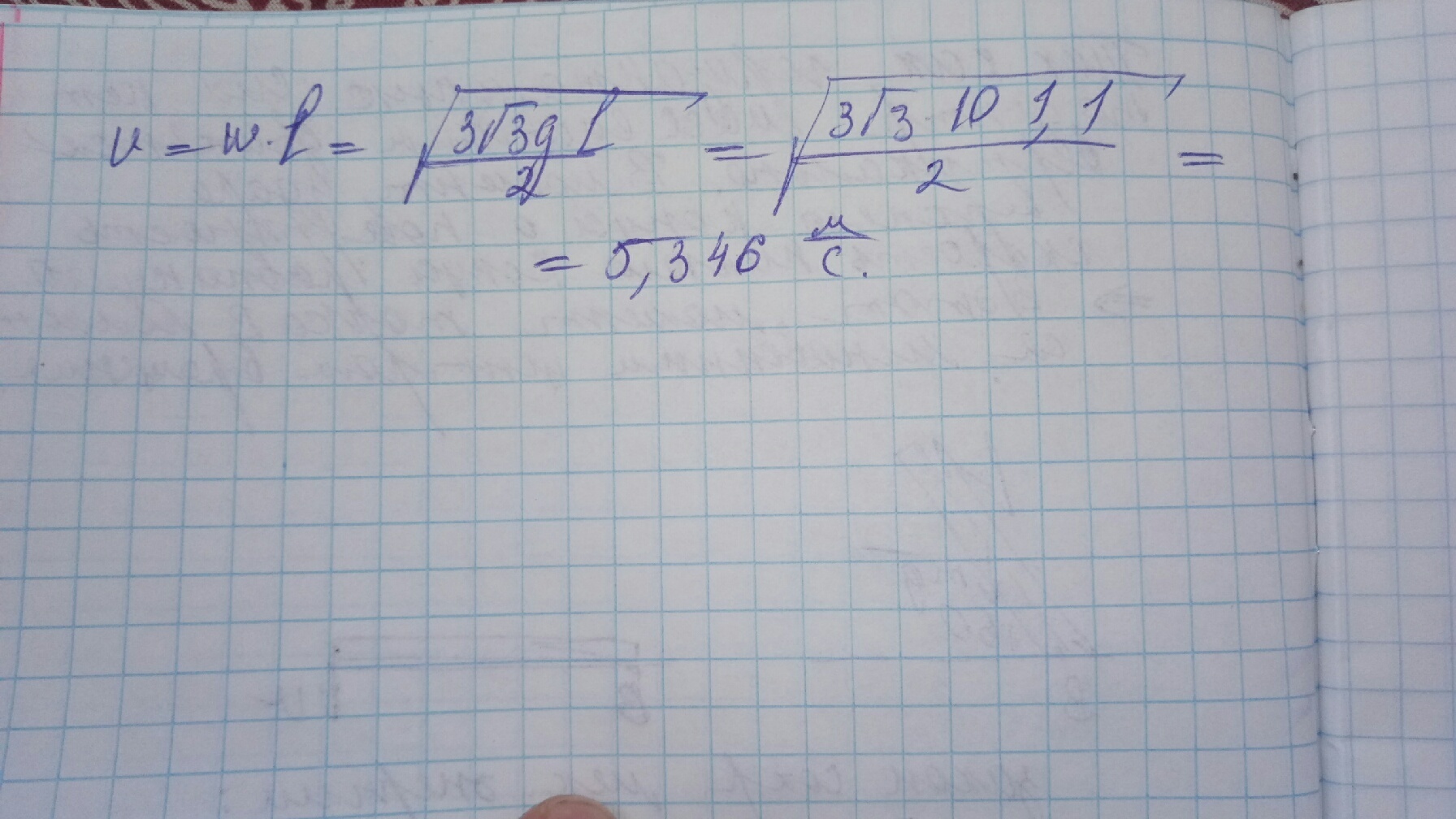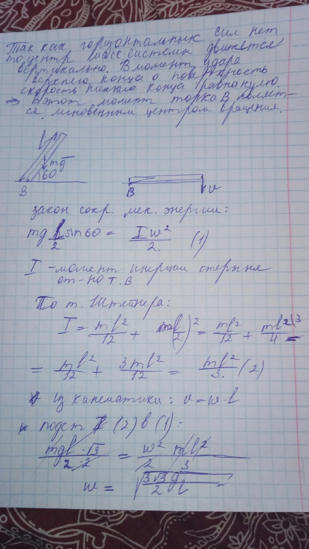 Однородный стержень длиной l = 110 см расположен под углом α = 60° к гладкой горизонтальной поверхности, на которую он опирается своим нижним концом. Стержень без толчка отпустили. Найти скорость верхнего конца стержня непосредственно перед падением его на поверхность.
