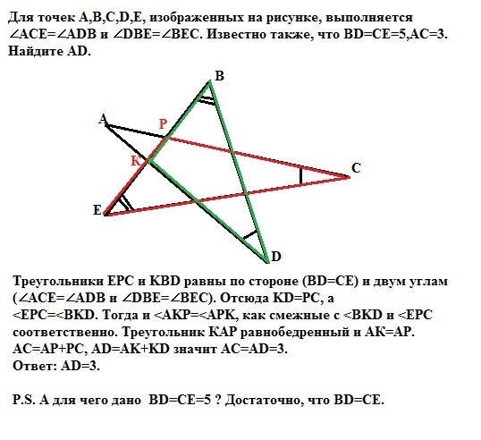Для точек A,B,C,D,E, изображенных на рисунке, выполняется ∠ACE=∠ADB и ∠DBE=∠BEC. Известно также, что BD=CE=5,AC=3. Найдите AD.