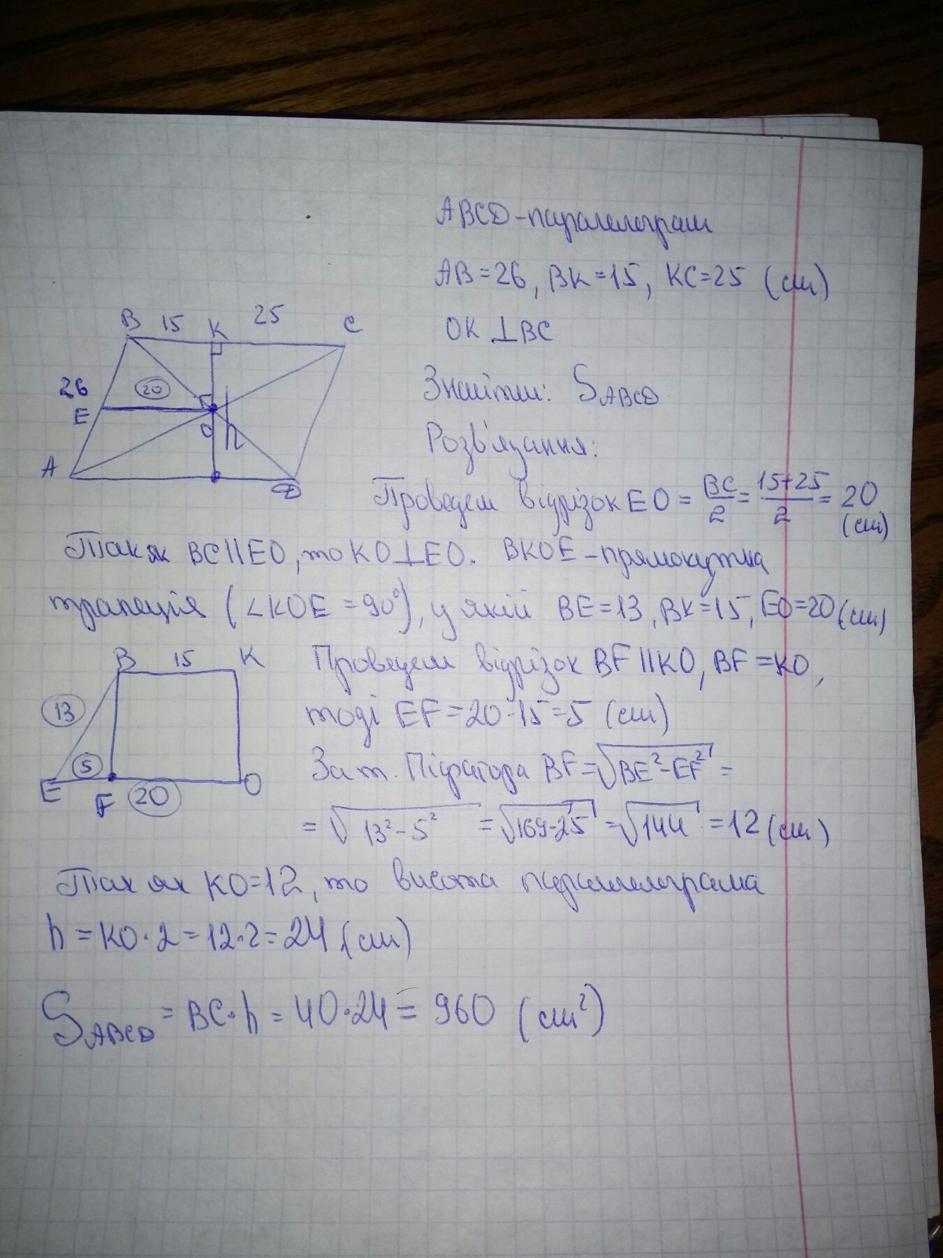 Одна із сторін паралелограма 26 см а перпендикуляр проведений з точки перетину діагоналей на другу сторону ділить її на відрізки 25 і 15 см. Обчислити площу паралелограма