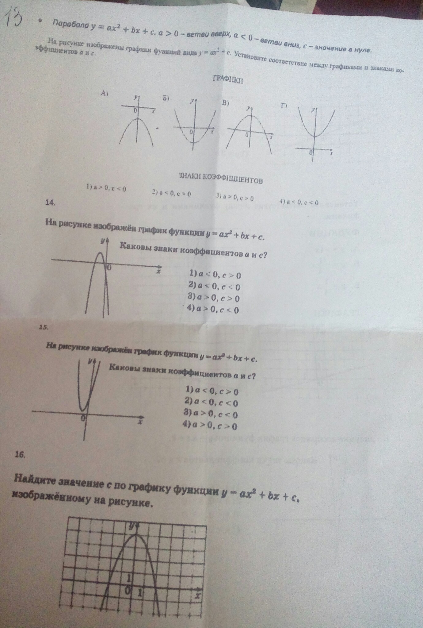 13) Если a>0, то ветви параболы направлены вверх.Значит у парабол Б) и Г) коэффициент а>0. Cоответственно, у парабол А) и В) коэфф. а<0, ветви вниз.