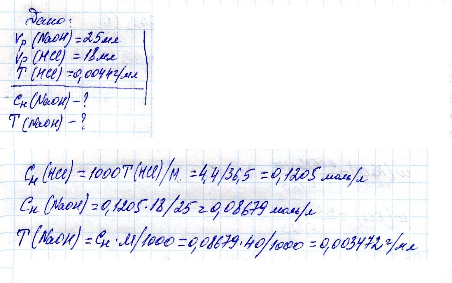Определите нормальность и титр раствора гидроксида натрия, если на титрование 25 мл его раствора израсходовали 18 мл раствора соляной кислоты с титром 0,0044 г/мл.