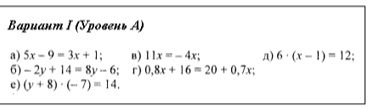 а). 5x-3x=1+9; 2x=10; x=10/2=5. б). -2y-8y= -6-14; -10y= -20; y=(-20)/(-10)=2 . в).11x+4x=0; 15x=0; x=0/15=0. г). 0,8x-0,7x=20-16; 0,1x=4; x=4/0,1=40. д). 6x-6=12; 6x=12+6; 6x=18; x=18/6=3. е). -7y-56=14; -7y= 56+14; -7y=70; y=70/(-7)= -10.