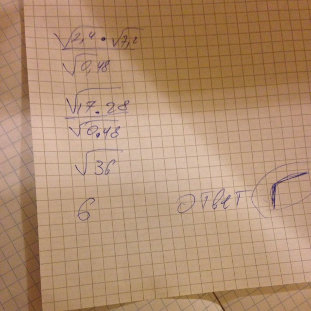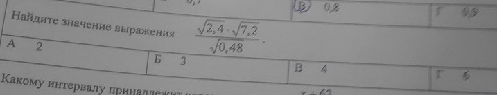 Корень из 2,4*7,2=корень из 17.28: корень из 0,48=корень из 36=6 Ответ: г