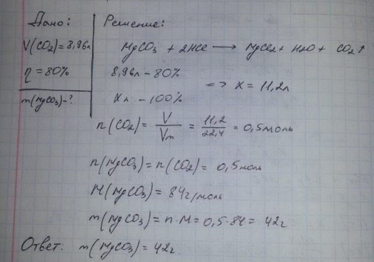 определите массу карбоната магния прореагировавшего с соляной кислотой , если при этом получено 8,96л оксида углерода (lV), что составляет 80% от теоретически возможного выхода