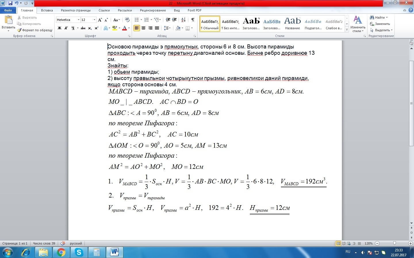 2) высоту правыльнои чотырыкутнои прызмы, ривновеликои даний пирамиди, якщо сторона основы 4 см.
