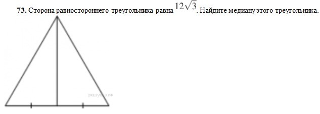 1-ый способ: Итак, медиана в равностороннем треугольнике равна высоте и биссектрисе. А высота делит равносторонний треугольник на два особых прямоугольных треугольника с углами 30, 60, 90. Получается прямоугольный треугольник с катетом, лежащим против угла 30, он равен половине гипотенузы и катетом, лежащим против угла 60, а он в √3 раза больше меньшего катета, а гипотенуза совпадает со стороной равностороннего треугольника, и она равна 12√3. Значит высота(катет, лежащий против угла 60) равна сторона треугольника:2*√3.