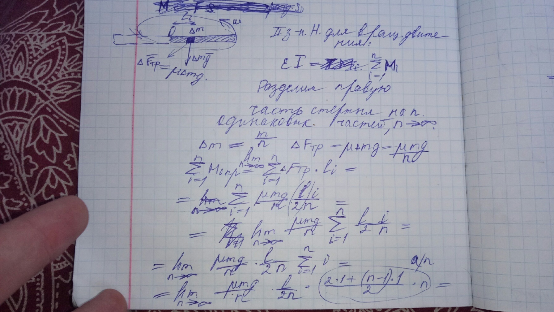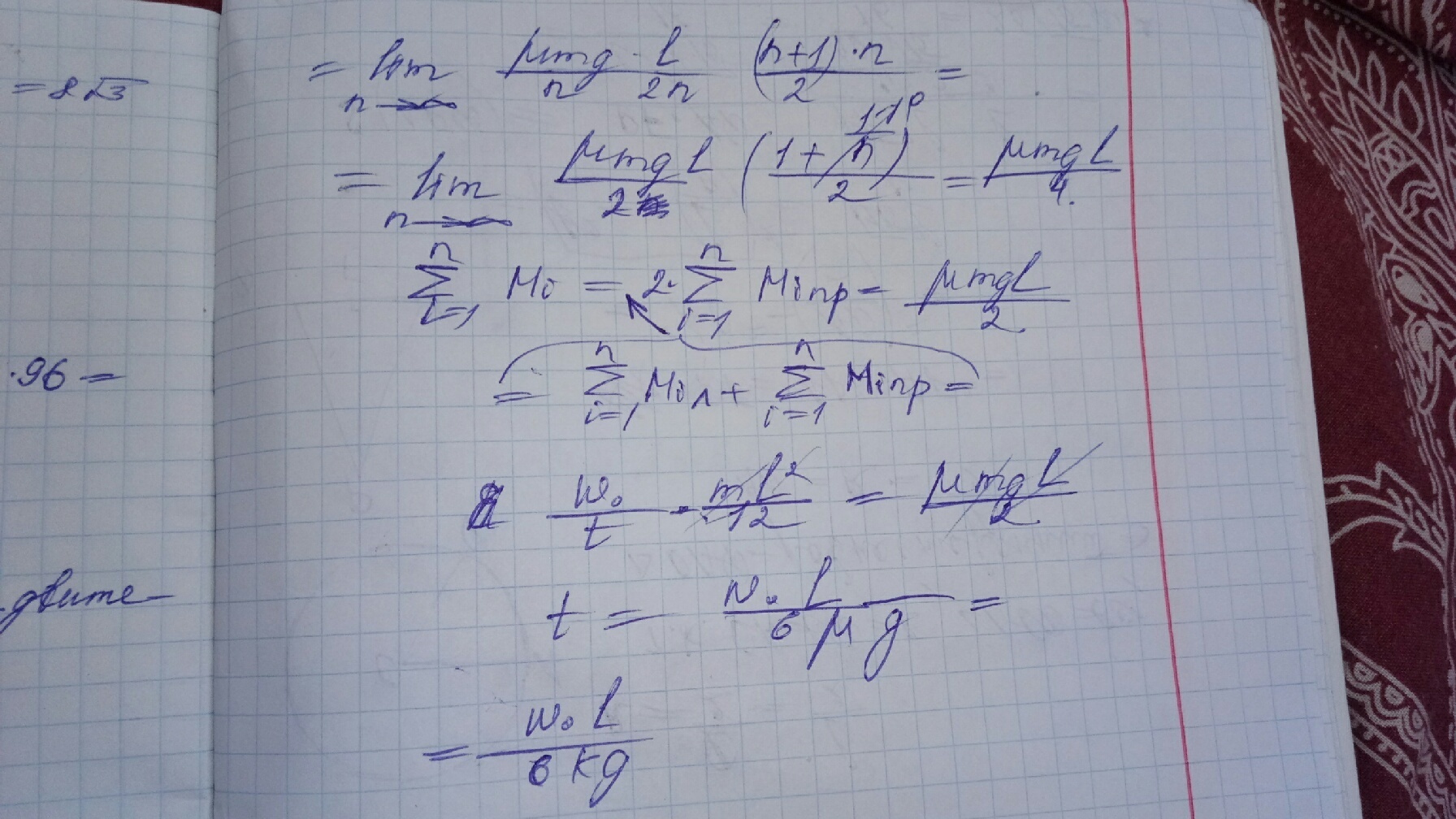 Палочке длинной L, лежащей на горизонтальной плоскости, сообщили угловую скорость ω относительно вертикальной оси, проходящей через середину палочки. Коэффициент трения между палочкой и плоскостью равен μ. Через какое время она остановиться?
