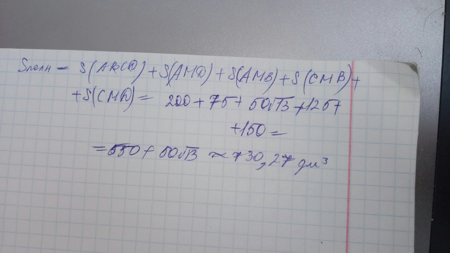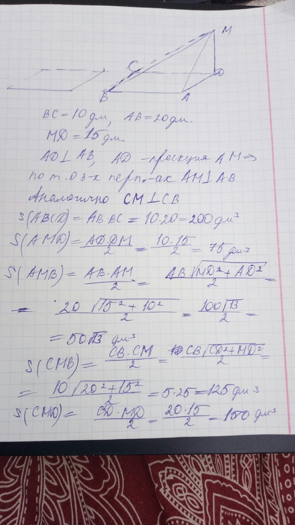 Дана четырехугольная пирамида MABCD, в основании которой лежит прямоугольник со сторонами 10 и 20 дм. Найдите площадь полной поверхности пирамиды, если боковое ребро MD, перпендикулярное плоскости основания, равно 15 дм.