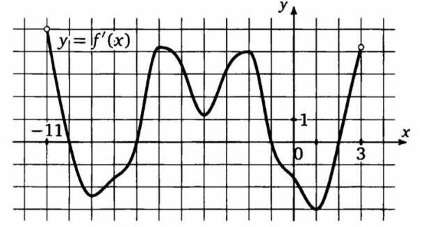 На рисунке представлен график производной функций f(x) которая определена на отрезке (-11;3). Во скольких точках касательная к графику функций f(x) (именно к функций f(x) а не к функций f'(x)) параллельна к y=3x-11 или лежит на этой прямой?