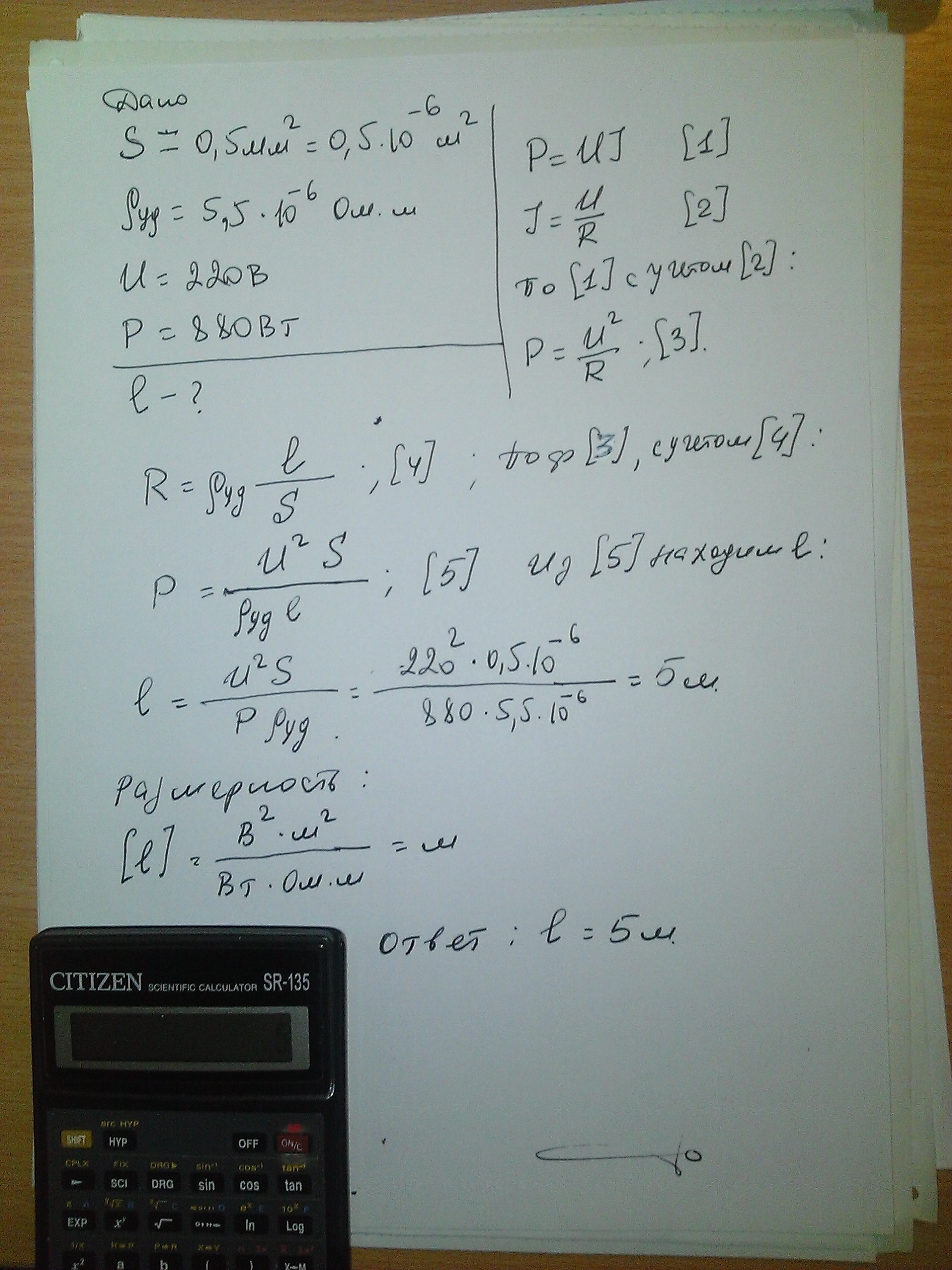 Спираль электроплитки изготовлена из проволоки сечением 0,5 мм2. Удельное сопротивление материала проволоки 5,5 мкОм×м. Определить длину проволоки, необходимой для изготовления спирали, чтобы при включении в сеть 220 В плитка потребляла мощность 880 Вт. Ответ дать в СИ.