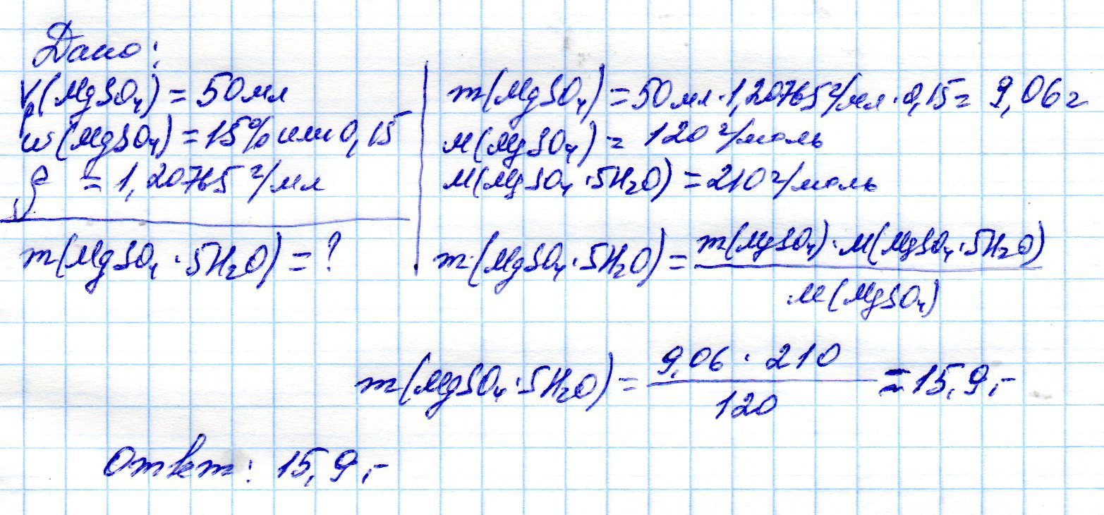 2) Необходимо приготовить раствор MgSO4 объёмом 50 мл с массовой долей 15% (ρ = … г/мл). Рассчитайте массу навески кристаллогидрата MgSO4∙5Н2О необходимую для приготовления данного раствора.