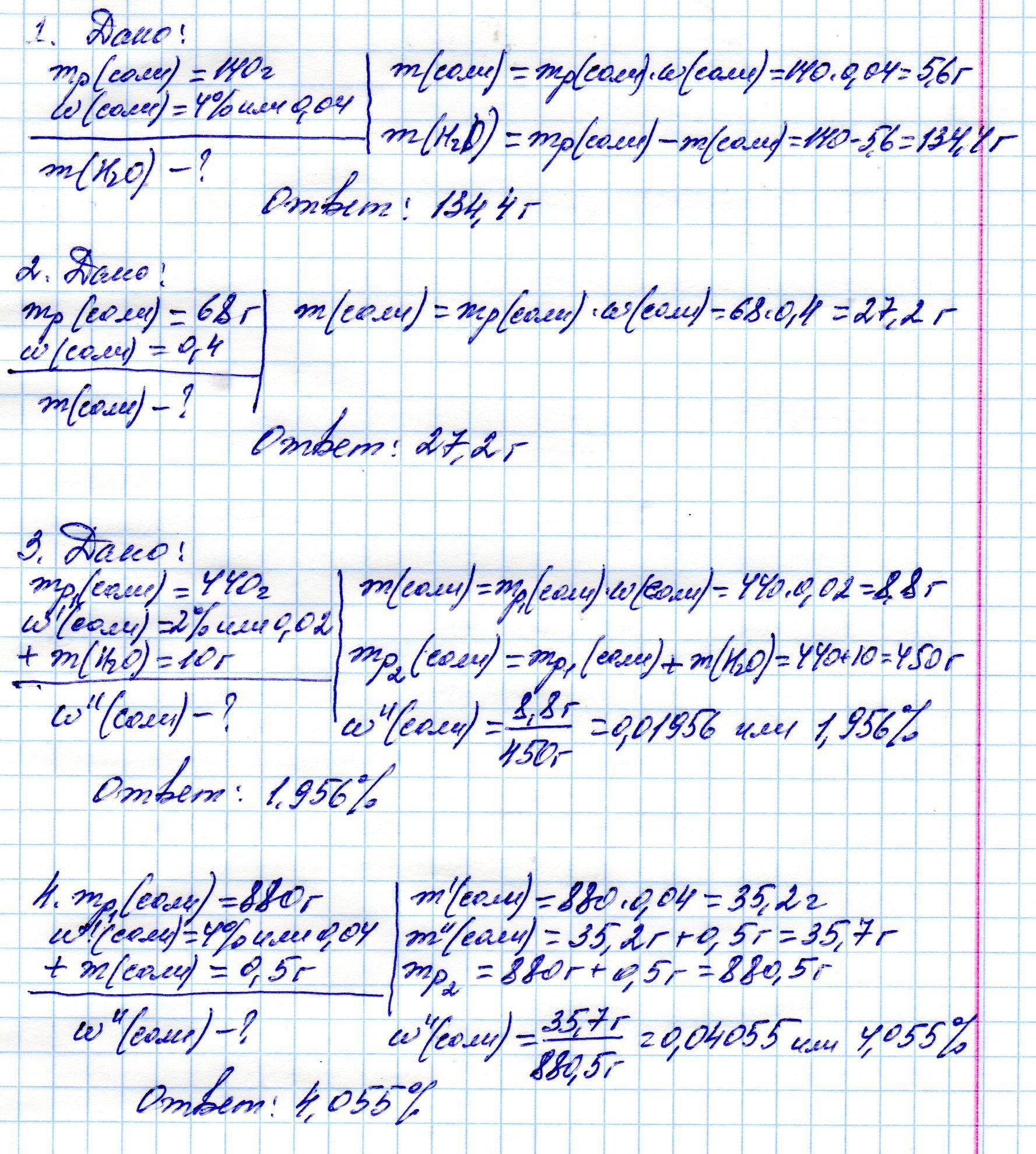 1) находим массу соли: (140*4)/100%= 5.6 грамм. Поскольку масса раствора 140 грамм, а в растворе 5.6 грамм соли, остальное -вода: 140-5.6 =134.4 грамма
