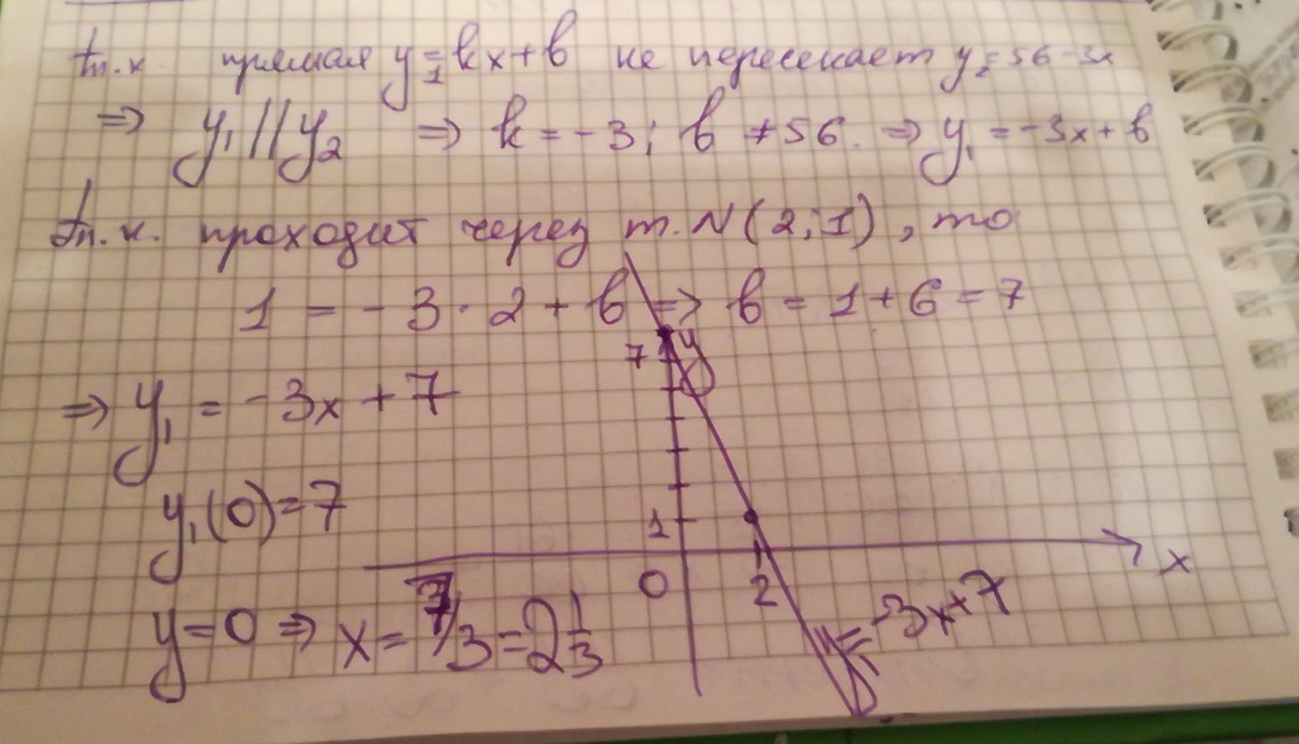 7 Класс. Постройте график функции y=kx+b , если известно, что он проходит через точку N(2;) и не пересекает график функции y=56-3x.