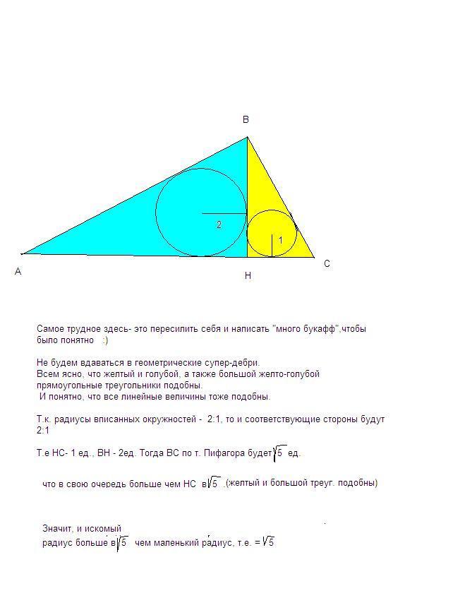 Высота прямоугольного треугольника делит его на 2 треугольника. Радиусы вписанных окружностей 1 и 2. Какой радиус описанной окружности в данный треугольник?