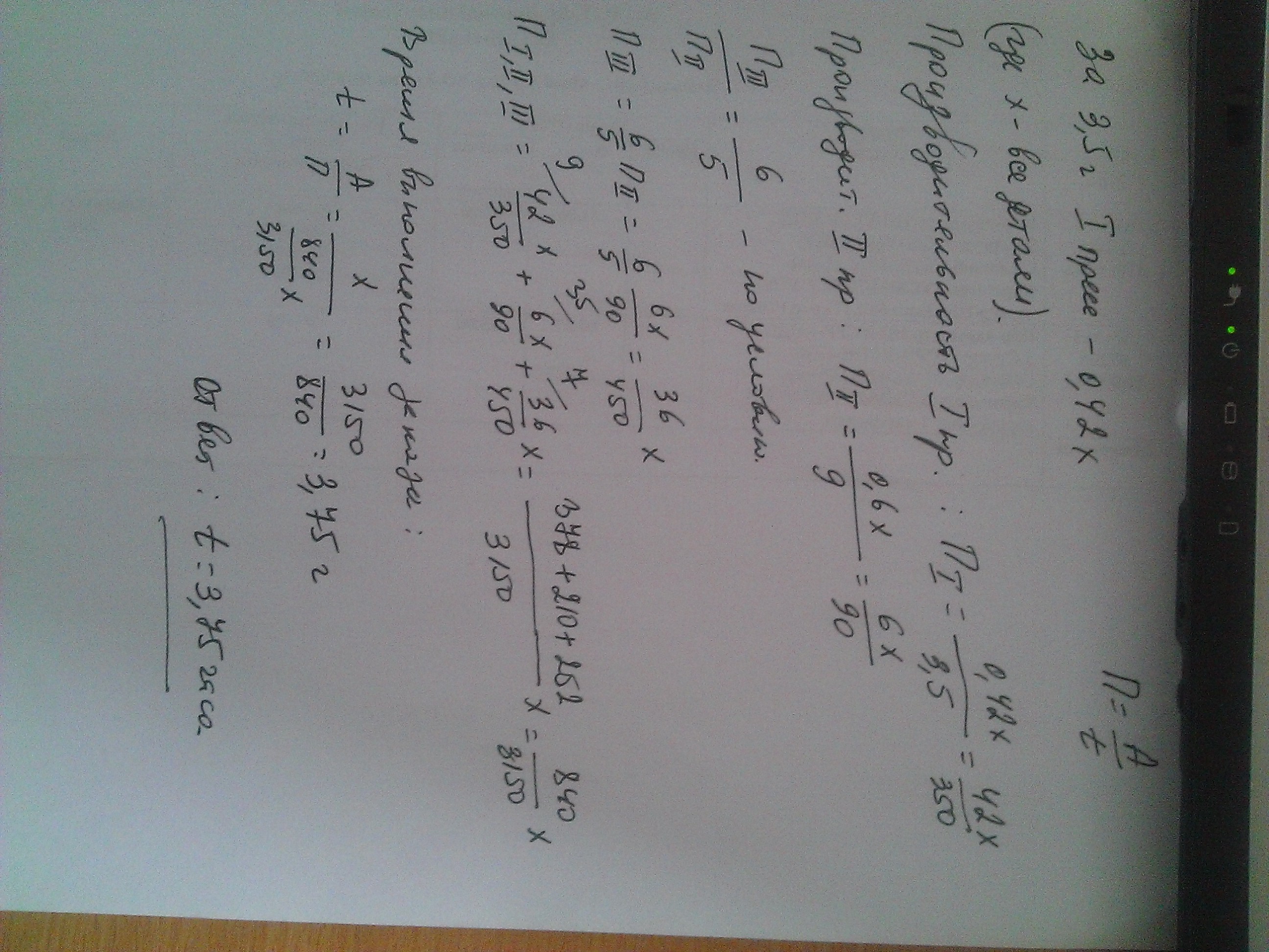 За 3,5 ч работы один штамповочный пресс может изготовить 42% всех заказанных деталей. Второй пресс за 9 ч работы может изготовить 60% всех деталей, а скорости выполнения работы на третьем и на втором прессах относятся как 6:5. За какое время будет выполнен весь заказ,если все три пресса будут работать одновременно?