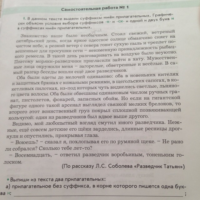 Необычным-суффикс н, ветреный-суффикс ен, октябрьский-суффикс ск, Одесское-суффикс ск, резкий-суффикс к (но возможно эта буква относится к корню!), повешенные-суффиксы ен и н, неизменную-суффикс н, рыбацкого-суффиксы ац и к, мужественные-суффиксы ен и н, загорелые-суффиксы е и л, обветренные-суффиксы ен и н, новеньких-суффикс еньк, защитных-суффикс н, кожаными-суффикс н, щегольских-суффикс ск, кокетливых-суффикс ив, светлые-суффикс л, льняного-суффикс ян, одинаковым-суффикс ов, ручных-суффикс н, запасных-суффикс н, гигантской-суффикс ск, одного-суффикс н, мелких-суффикс к, воинственный-суффиксы ен и н, сплошной-суффикс н, позвякивающей-суффиксы ив, а и ющ, любопытный-суффикс н, нежные-суффикс н, детские-суффикс ск, длинные-суффикс н, воробьиной-суффикс ин, тоненьким-суффикс еньк.