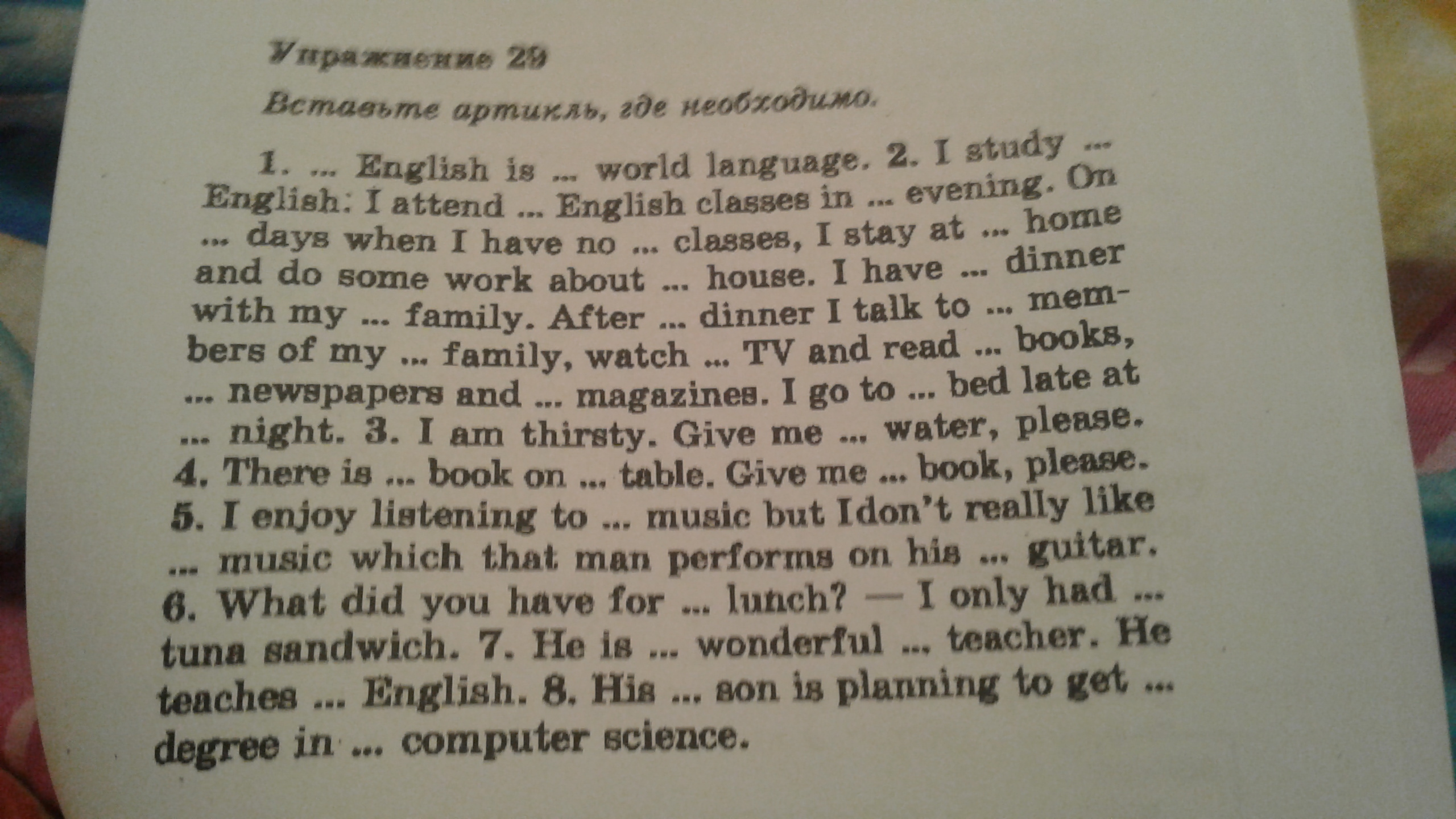 1a 2 I study English.I attend English classes in the evening.On the days when I have no classes, I stay at home and do some work about the house.I have dinner with my family. After dinner I talk to the members of my family, watch TV and read books, newspapers and magazines. I go to bed late at night. 3 some 4 a, the, the 5-,the, - 6 -,a 7 a, -, - 8 -, a, -