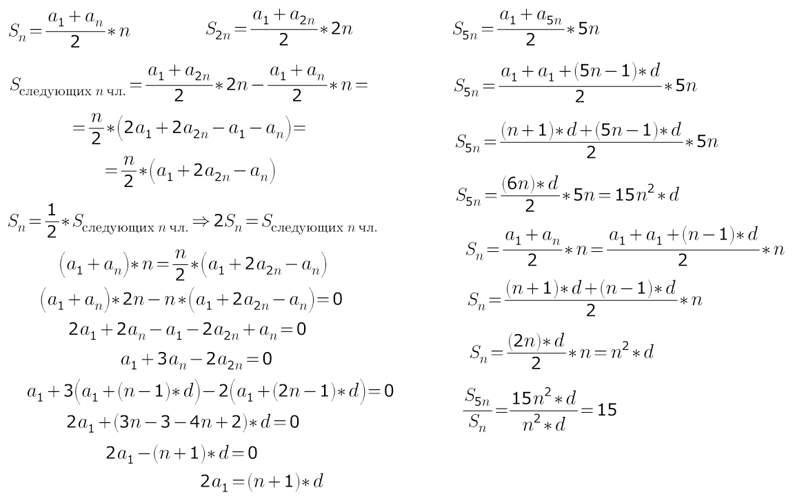 Сумма первых n членов возрастающей арифметической прогрессии равна половине суммы следующих её n членов. Во сколько раз сумма первых 5n членов этой прогрессии больше суммы её первых n членов?