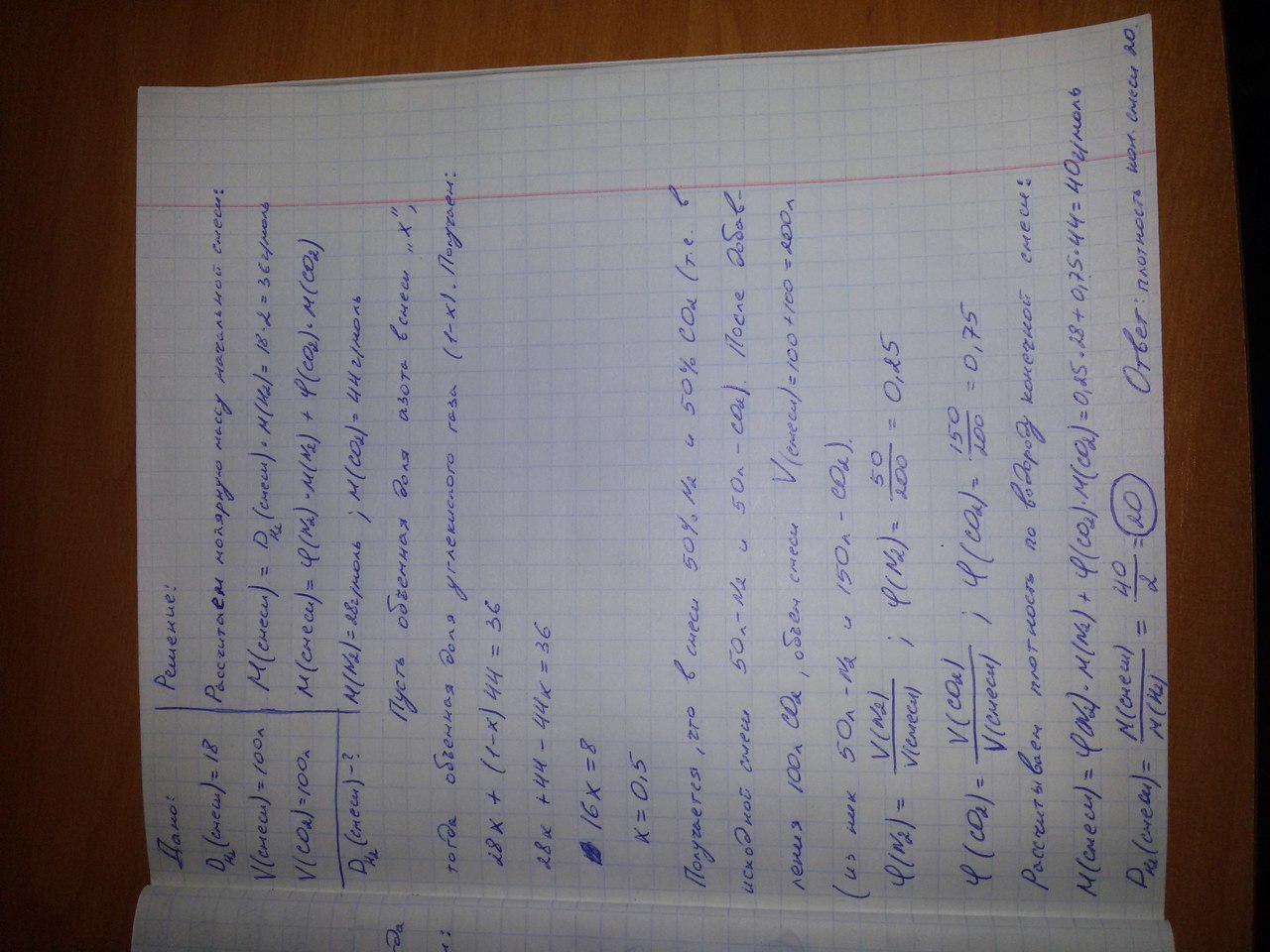 Смесь азота и углекислого газа имеет плотность по водороду 18. К 100 л этой смеси добавили 100 л углекислого газа. Рассчитайте плотность по водороду конечной смеси.