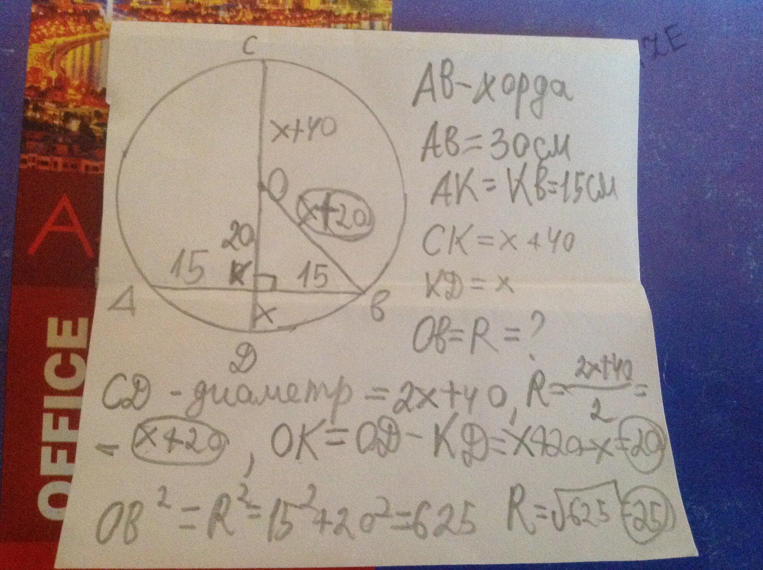 хорда довжиною 30 , перпендикулярна до діаметра і ділить його на відрізки , різниця між якими дорівнює 40 . обчисліть радіус кола