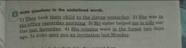 1Who took their child to the circus yesterday? Whom did they take to the circus yesterday? Where did they take their child yesterday? When did they take their child to the circus? 2Who was in the office yesterday morning?Where was she yesterday morning? When was she in the office? Whose sister helped me to tidy our flat last Saturday? Whom did my sister help to tidy our flat last Saturday? What did my sister help me do last Saturday? When did my sister help me to tidy our flat? Who was in the forest two days ago?Where were his cousins two days ago?How many days ago were his cousins in the forest? What did John do last Monday? Whom did John send an invitation last Monday? What did John send you last Monday? When did John send you an invitation?