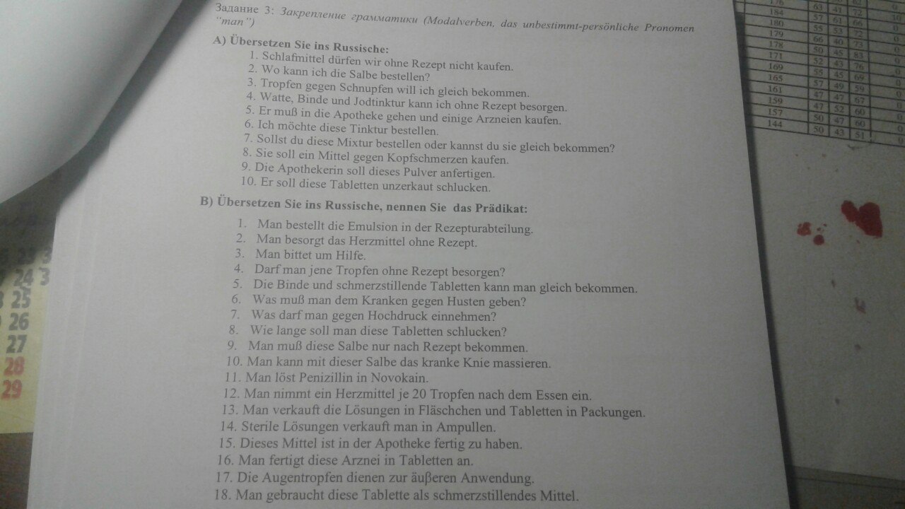 2. В аптеке имеется два отдела. В отделе рецептов заказываю я мазь. Во втором отделе в наличии есть различные лекарства: таблетки, порошки, настойки, мази и капли. Болеутоляющие таблетки и сердечные препараты получаю я по рецепту. Настойки и микстуры служат для внутреннего употребления и мази служат для наружного употребления. Моя мама страдает бессоницей. Я иду в аптеку и покупаю для нее снотворное.