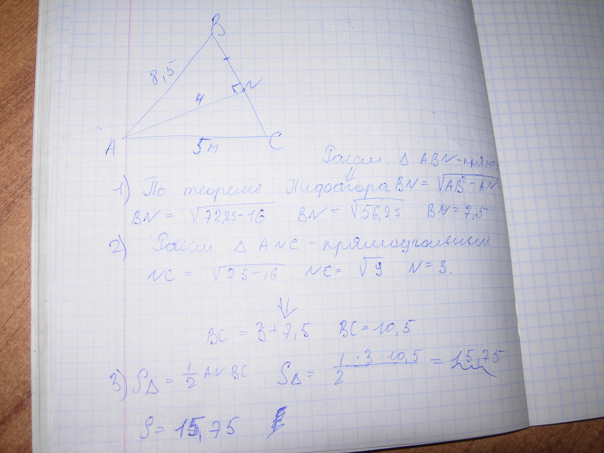 2)Вычислить S треугольника АВC ,если АВ= 8,5 м, АС= 5 м, АN - высота и равна 4 м.