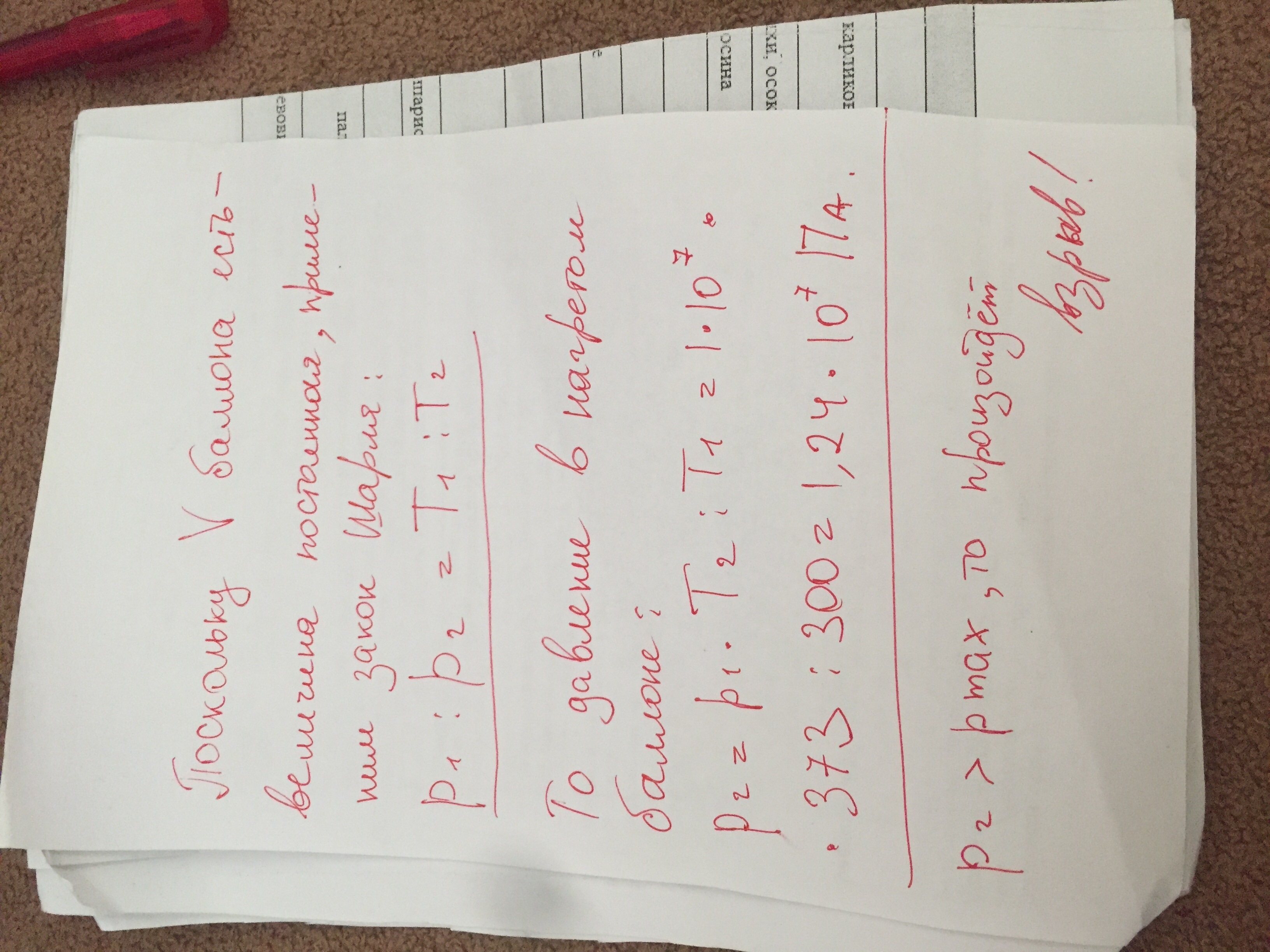 Баллон с газом при t1=27 C имеет давление P1=10^7 Па: предельно допустимое давление Pmax=1,2*10^7 Па. При пожаре баллон нагрелся до t2=100 C. Определить давление в нагретом баллоне и есть ли опасность взрыва?
