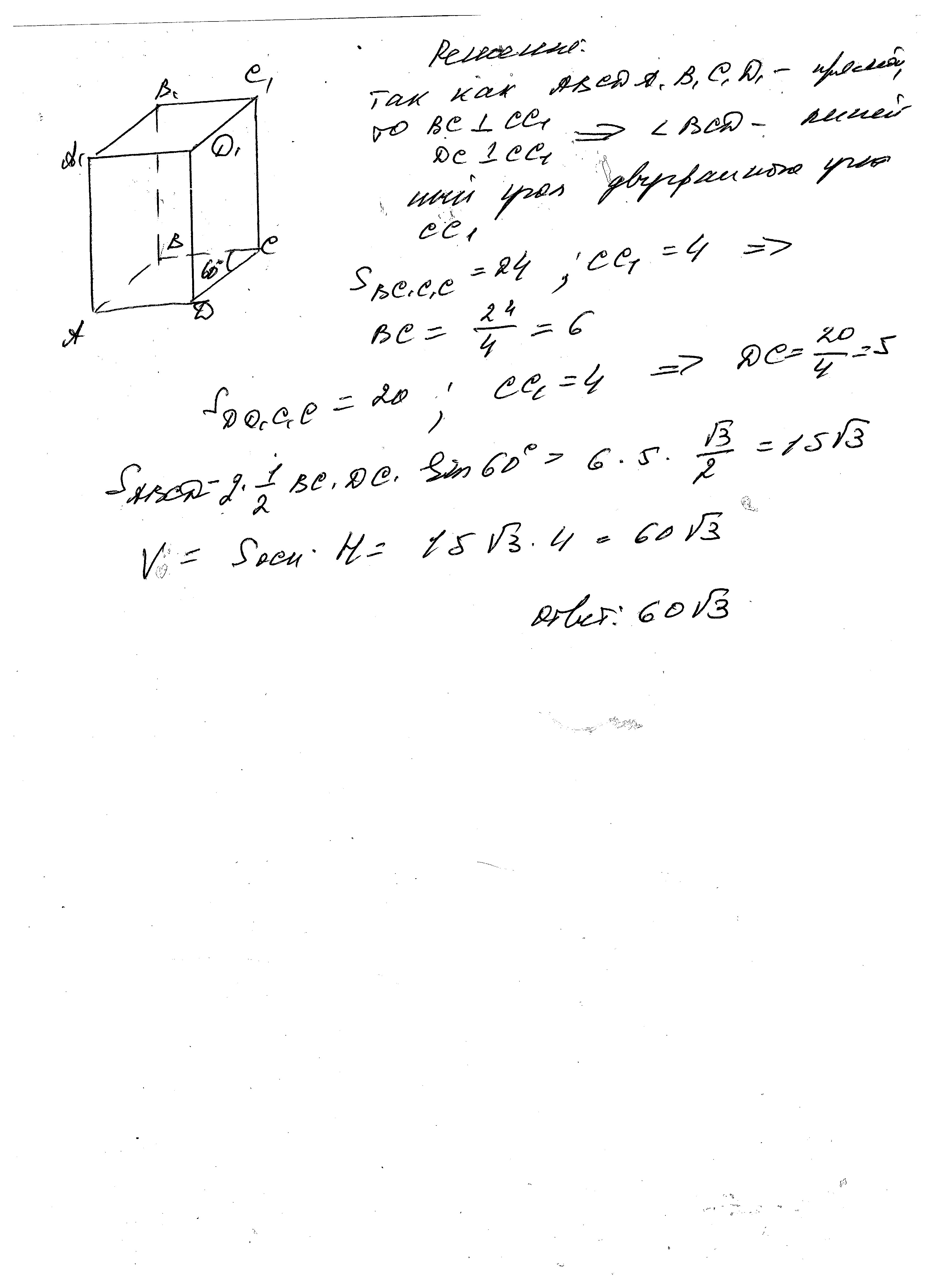 площади двух боковых граней прямого параллелепипеда равны 24 и 20, а угол между ними 60. найти объём параллелепипеда, если боковое ребро равно 4