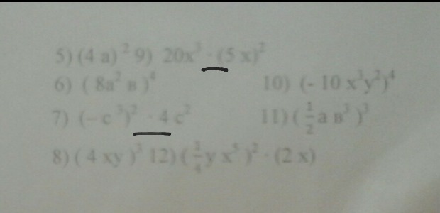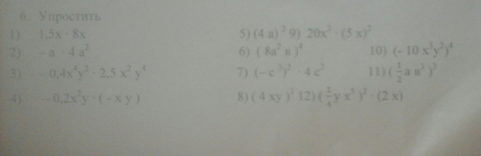 1) 12x^2; 2) -4a^3; 3) -x^6y^6; 4) 0.2x^3y^2; 5) 72000a^2x^5; 6) 4096a^8в^4; 7) 4c^8; 8) 96x^10y^5; 10) 10000x^12y^8; 11) 1/8a^3в^9