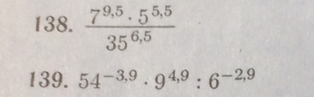 frac{7^{9,5}cdot 5^{5,5}}{35^{6,5}}=  frac{7^{9,5}cdot 5^{5,5}}{7^{6,5}cdot 5^{6,5}} =frac{7^3}{5}= frac{343}{5} =68,6\\\ 54^{-3,9}cdot 9^{4,9}:6^{-2,9}=frac{9^{4,9}, cdot , 6^{2,9}}{54^{3,9}} = frac{9^{4,9}cdot 6^{2,9}}{9^{3,9}cdot 6^{3,9}} =frac{9}{6}=frac{3}{2} =1,5