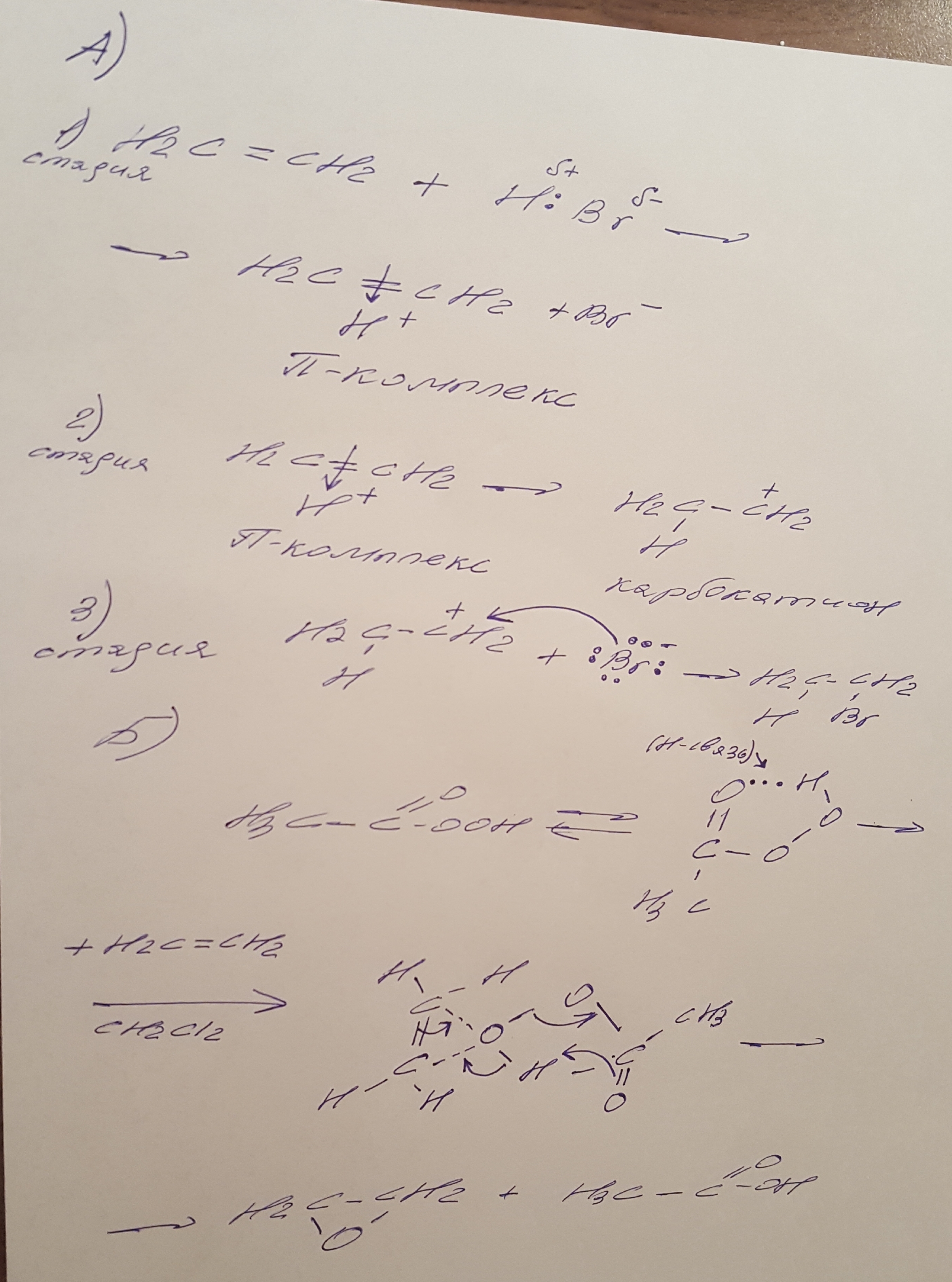 1) В первой стадии полярная молекула HBr будет приближаться к двойной связи положительным концом своего диполя. Пи-электроны углеводорода будут притягивать положительно заряженный протон и отталкивать анион брома. Далее общая пара электронов перейдет к брому,а протон будет взаимодействовать с пи-электронами алкена. Получится пи-комплекс.