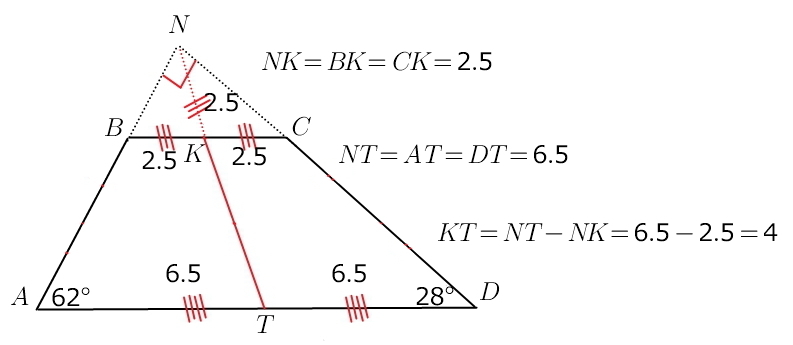 Углы при большем основании трапеции равны 28 и 62 . Основания трапеции равны 5 и 13. Чему равен отрезок,