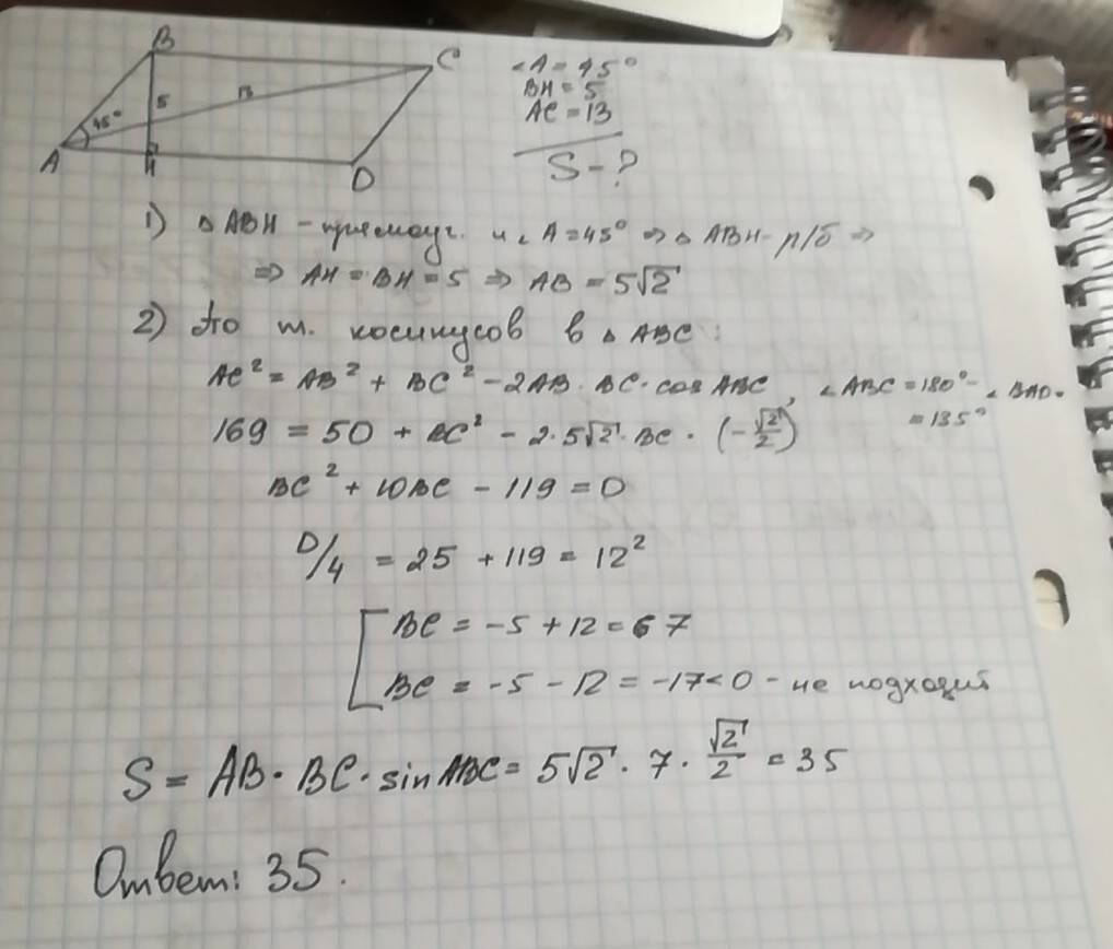 Найти S парал-ма, если его наибольшая диагональ 13, а наименьшее значение высоты и угла равны соответственно 5 и 45. (можно с рисунком)