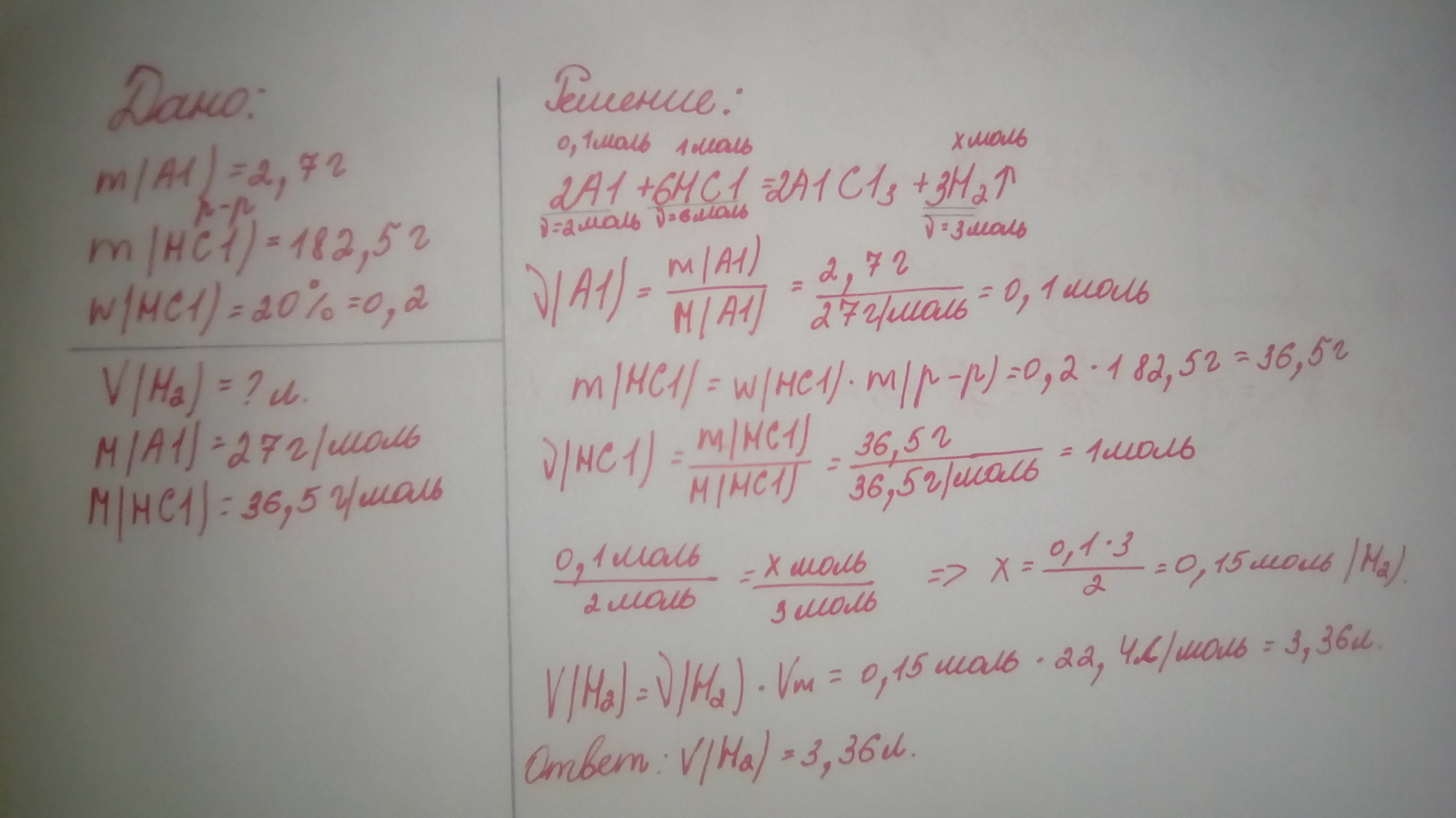 При взаимодействии 2,7 г алюминия и 182,5 г 20%-ного раствора HCl выделился H объемом (в л, при н. у.)?