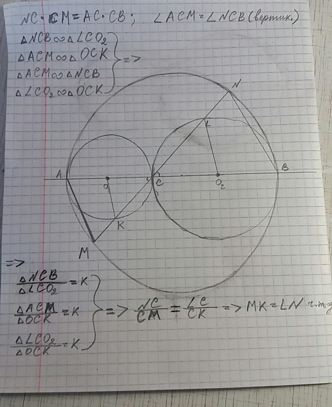 На отрезке AB взята точка C. Прямая, проходящая через точку C, пересекает окружности диаметрами AC и BC в точках K и L, а также окружность с диаметром AB – в точках M и N. Докажите KM = LN.