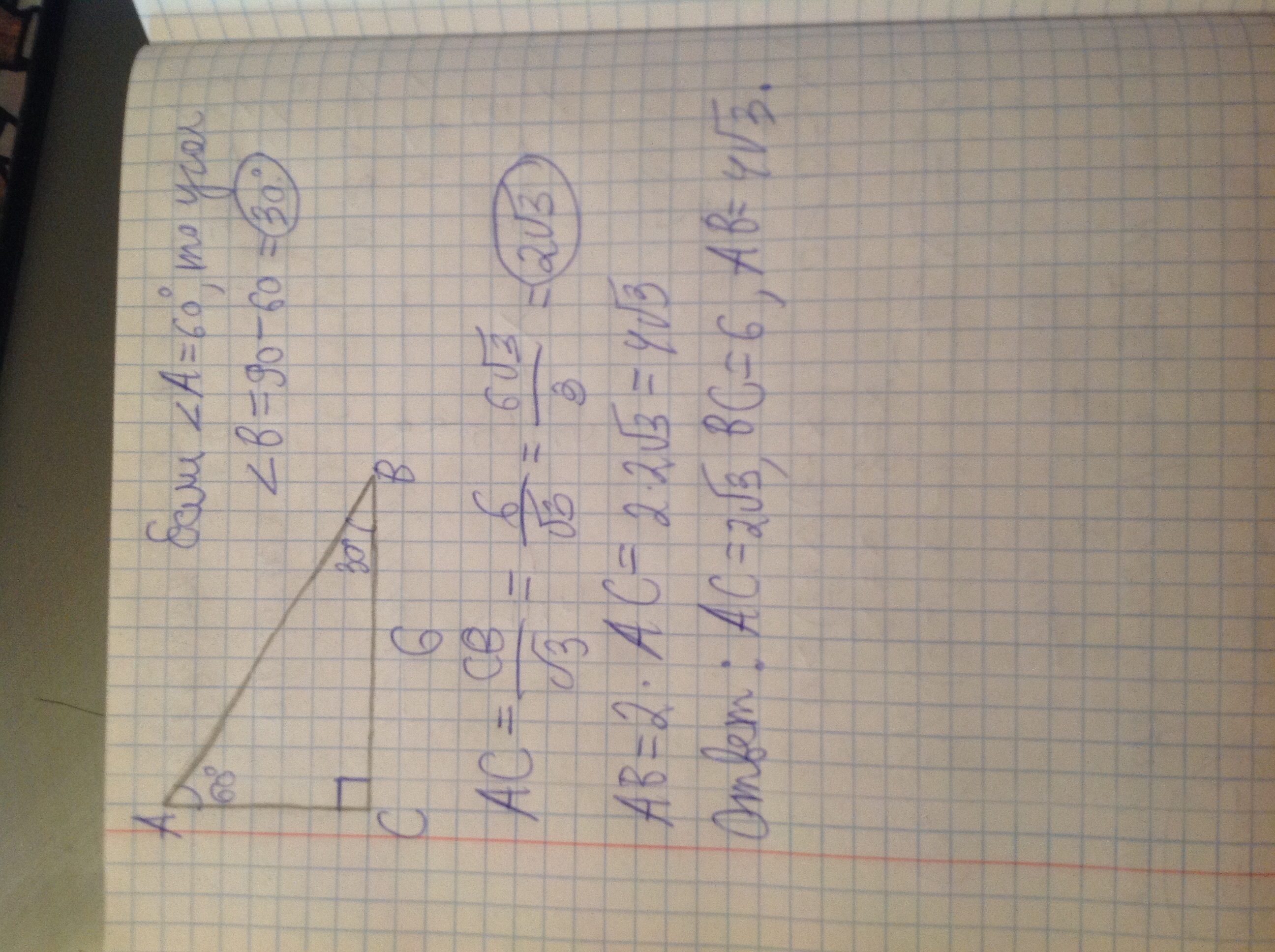 Дан прямоугольный треугольник ABC у коротого угол c прямой катет bc равен 6 см иA равен 60 градусам. Найдите остальные стороны ABC