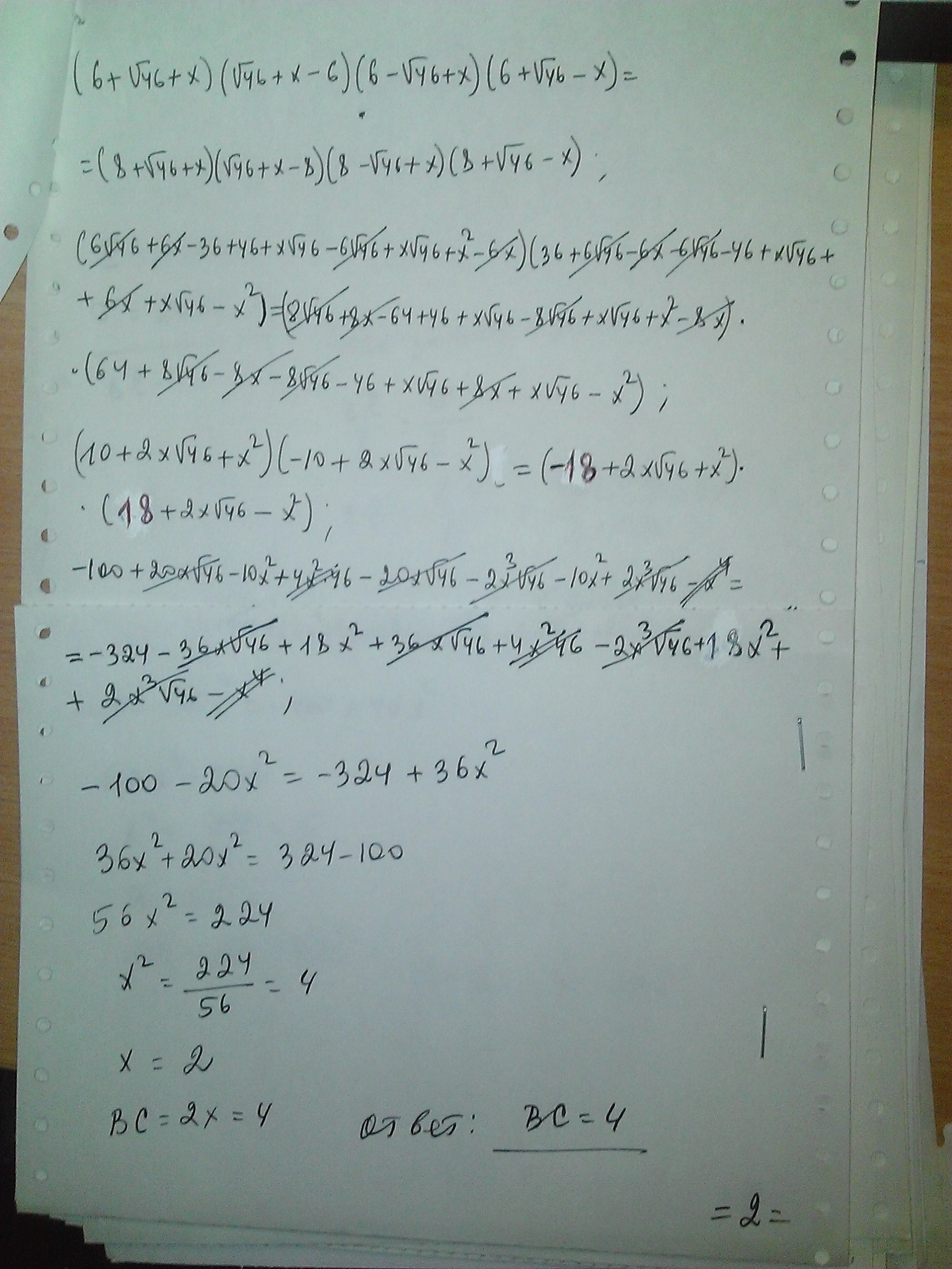 ВС^2=2*(36+64)-46*4=200-184=16.