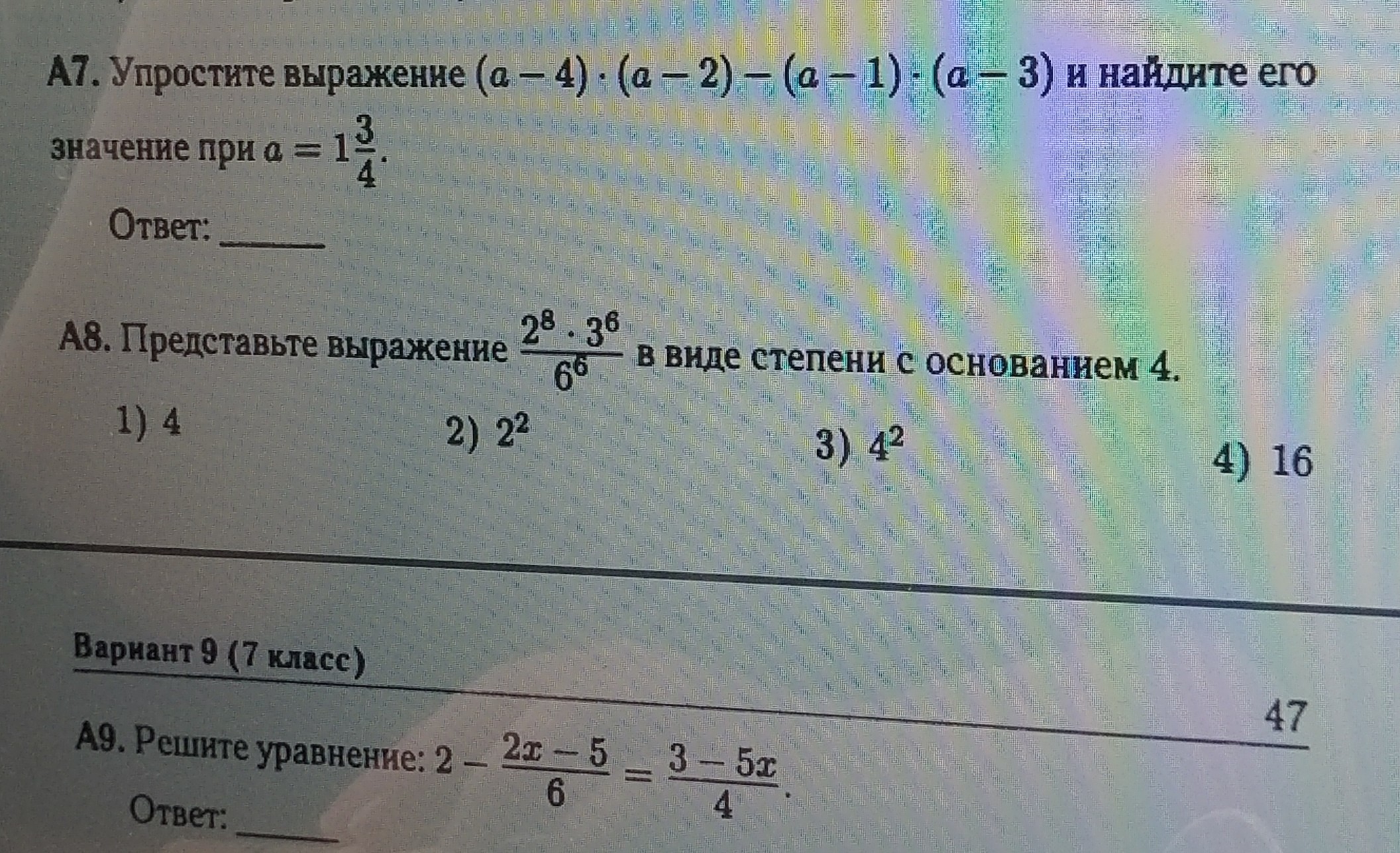 А7=(а-4)*(а-2)-(а-1)*(а-3)=(а+2)*(а-2)*(а-2)-(а-1)*(а-3)=(а+2)*(а+2)-(а-1)*(а-3)=-(а-1)*(а-3)=(-7/4+1)*(7/4-3)=-3/4*- 5/4=15/4=3 3/4-но это не точный ответ.