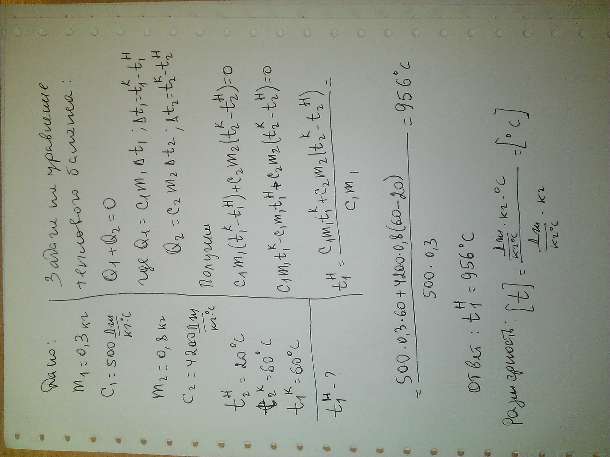 Для укрепленные массой 0,3 кг стальной деталь опустили в воду массой 0,8 кг. Температура воды от 20 градусов стал 60 градусов.Найти начальную температур деталь,если молярной теплоёмкости стальи 500Дж/Кг°C ,а воды 4200Дж/Кг°C.