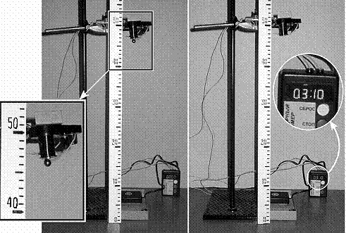 На рисунках А и Б приведены фотографии установки для изучения свободного падения тел. При нажатии кнопки на секундомере шарик отрывается от электромагнита (рис. А), секундомер включается; при ударе шарика о датчик, совмещенный с началом линейки с сантиметровыми делениями, секундомер выключается (рис. Б).