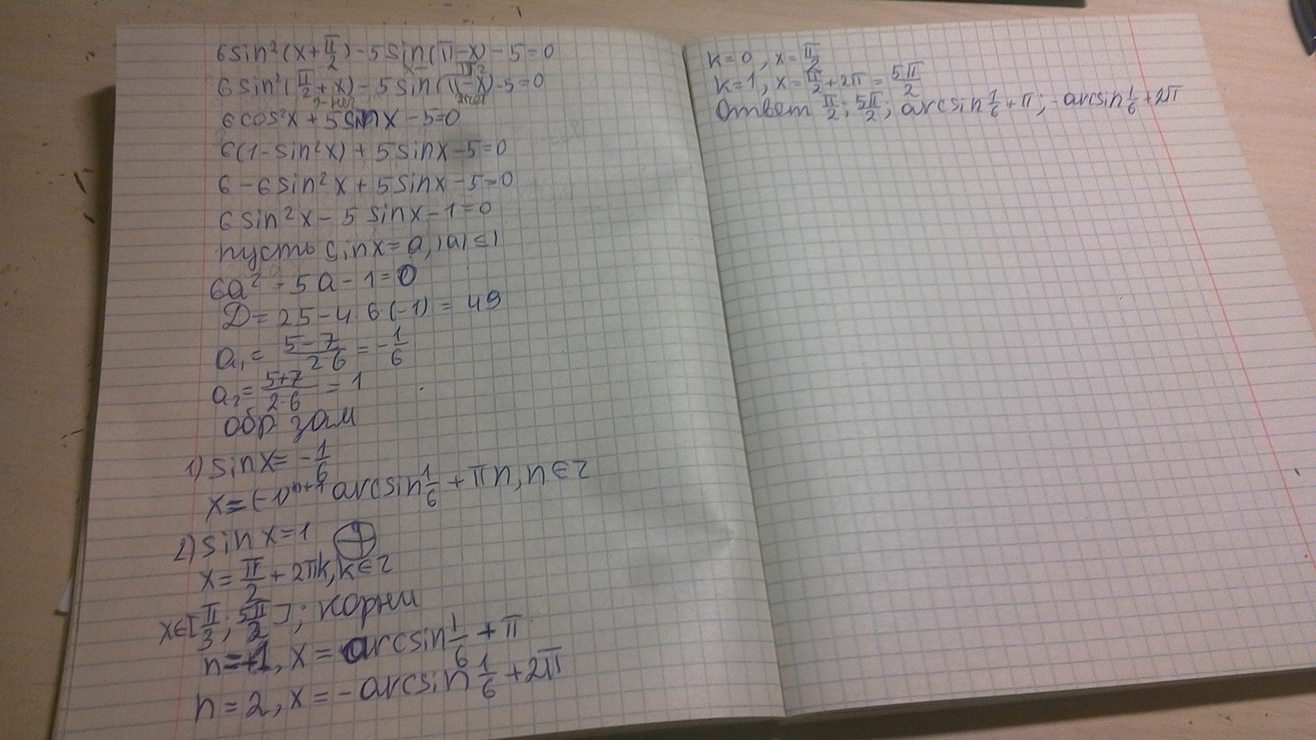 Дано уравнение 6sin^2(x+π/2)-5sin(x+π)-5=0. а) Решите уравнение Б) найдите все корни этого уравнения, принадлежащие [π/3;5π/2]. Помогите пожалуйста!