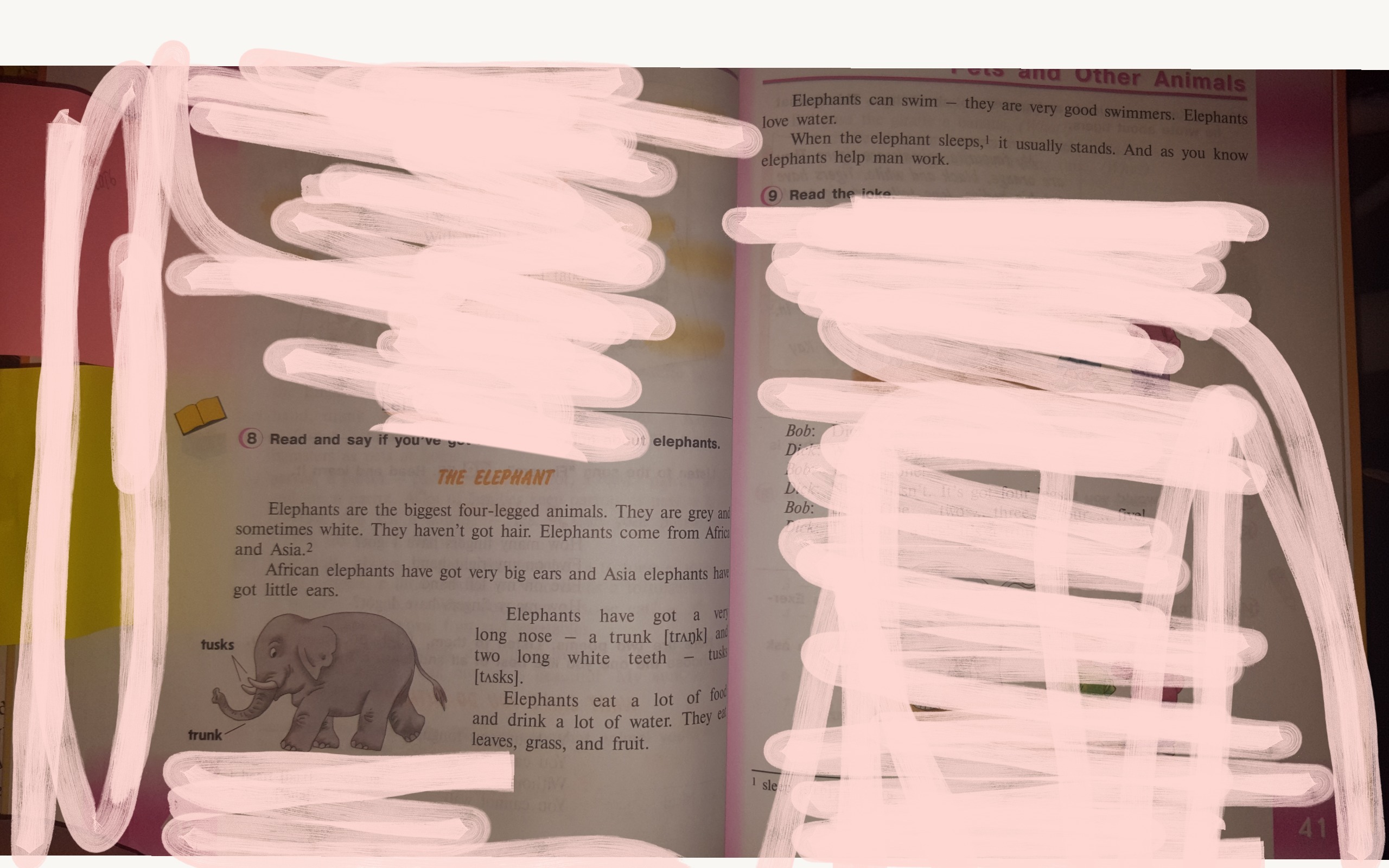 Слоны имеют длинный хобот и 2 белых бивня. Слоны много едят и пьют едят они траву, фрукты.