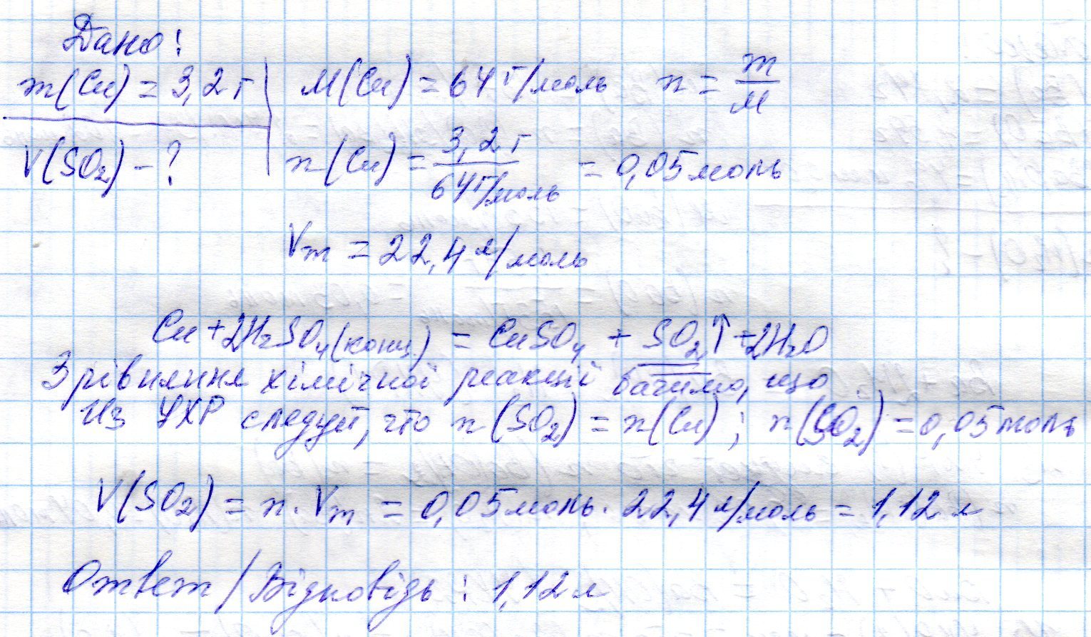 який об'єм сульфур оксиду утвориться під час взаємодії 3,2г міді з конц сульфатною кислотою взятою в надлишку
