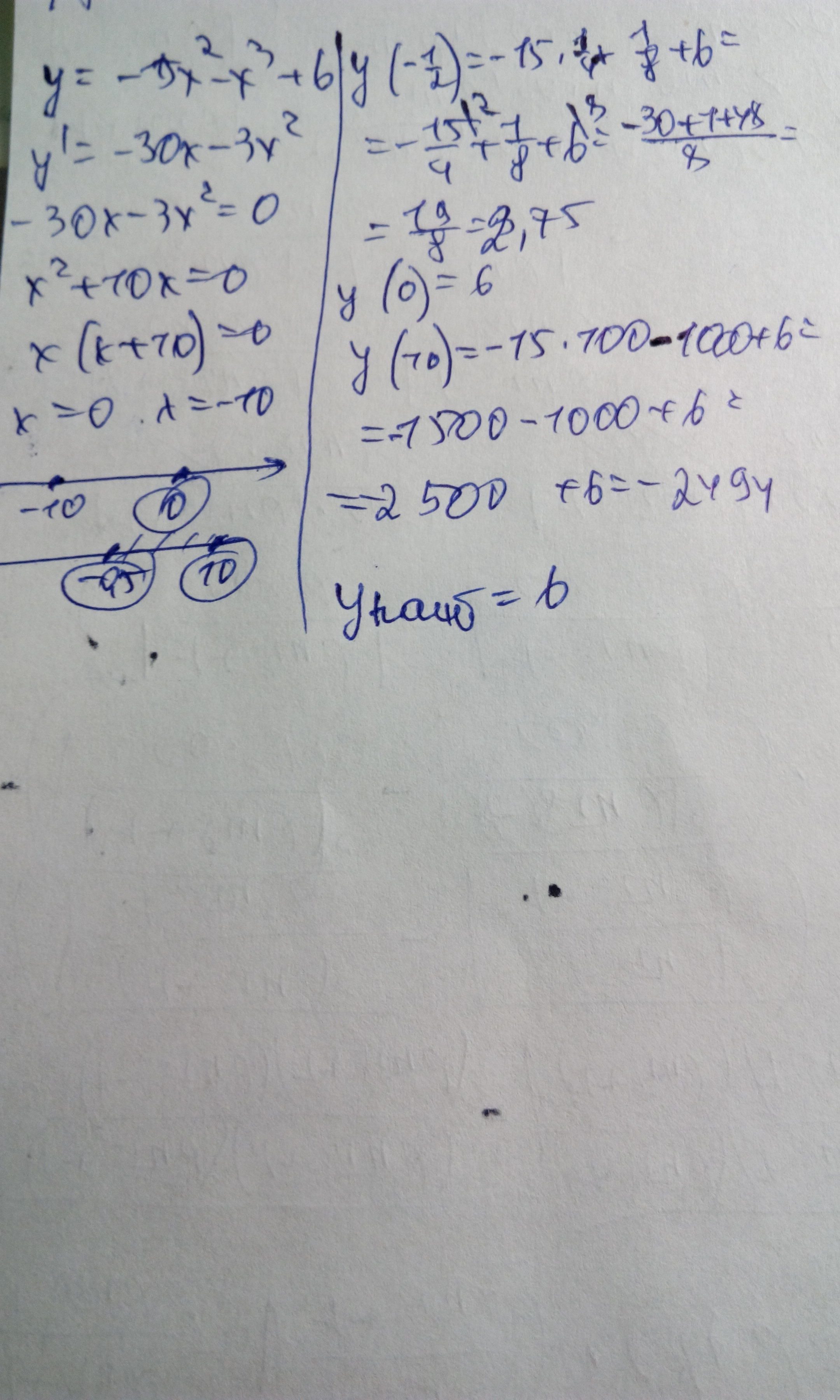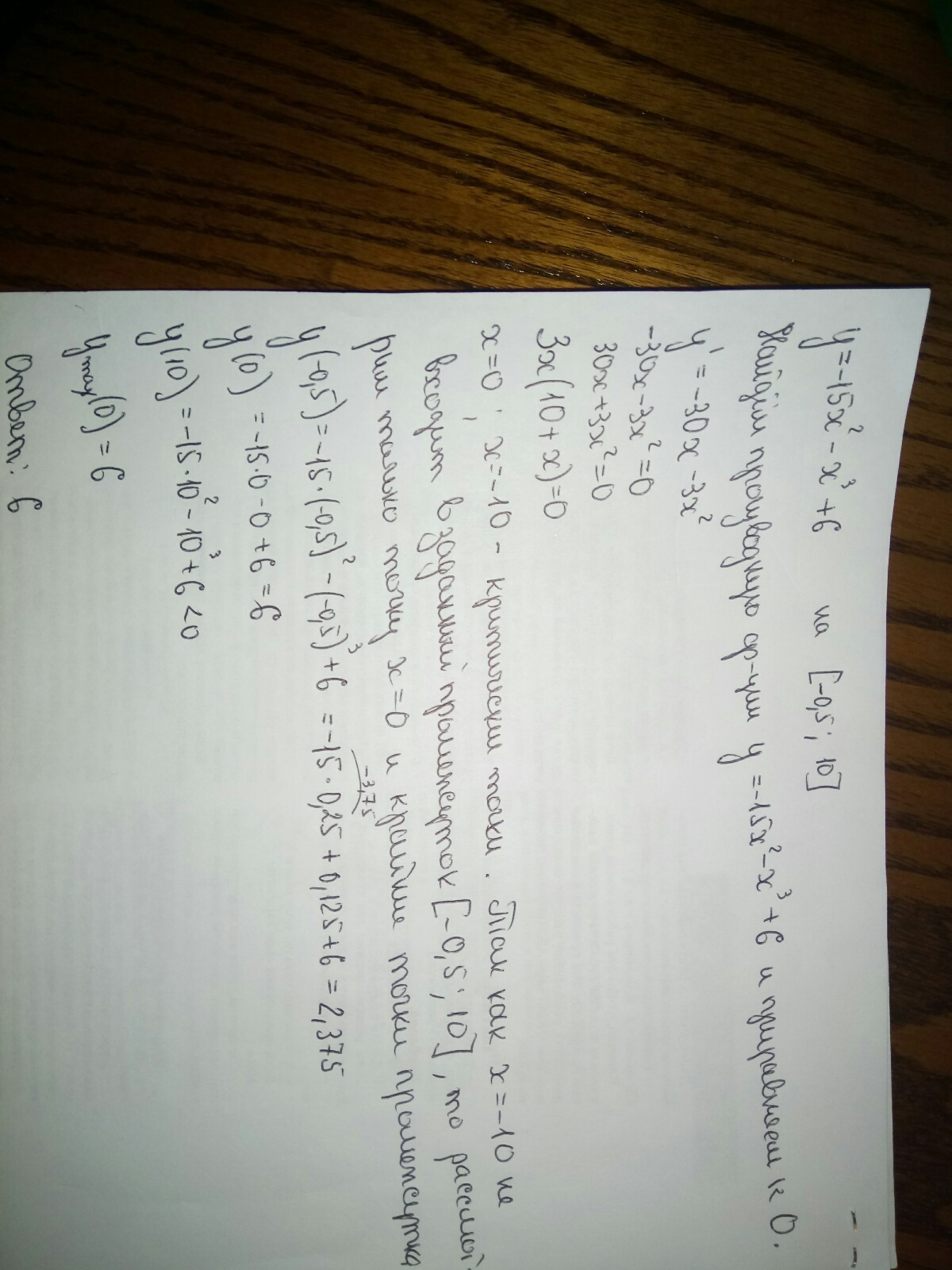 здравуствуйте уважаемые умники и умницы)помогите пожалуйста!Найдите наибольшее значение функции y=-15x^2-x^3+6 на отрезке [-0,5;10].