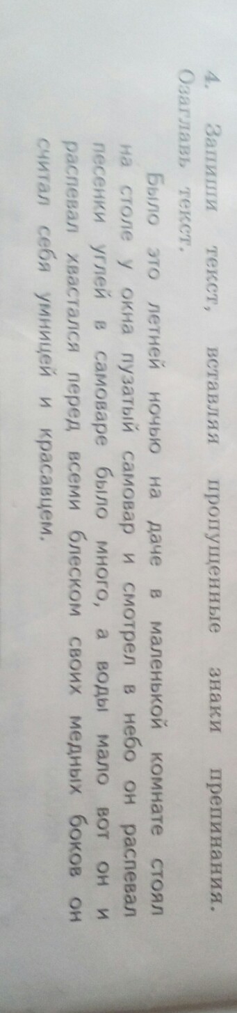 было это летней ночью, на даче. В маленькой комнате стоял на столе у окна пузатый самовар и смотрел в небо. Он распевал песенки. Углей в самоваре было много, а воды мало, вот он и распевал и хвастался перед всеми блеском своих медных боков. Он считал себя умницей и красавцем